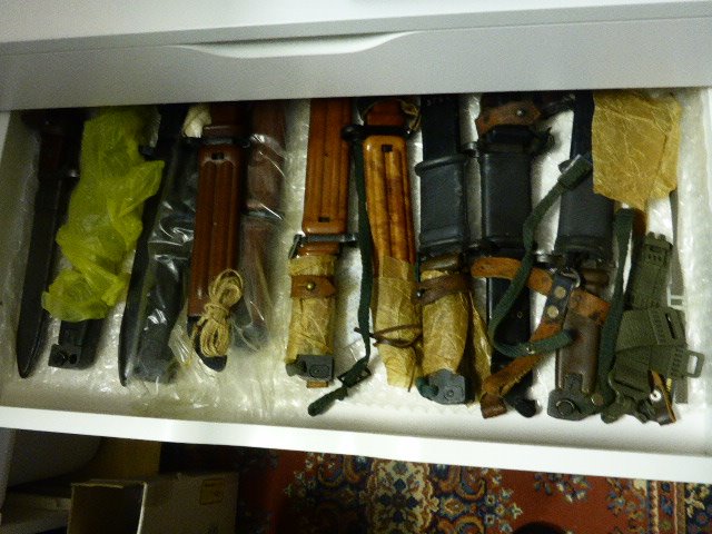 How do you display or store your items? This is how I display my main collection. These three pictures are of one wall displaying what I consider major variations of AK47, AKM and AK74 bayonets. They are easy to locate and remove for study if needed. There is a second wall with a further 100+ AK related bayonets including spikes, non-traditional and minor variations. Spares and accessories such as hangers, wrist straps, insulators, etc., are kept in drawers.