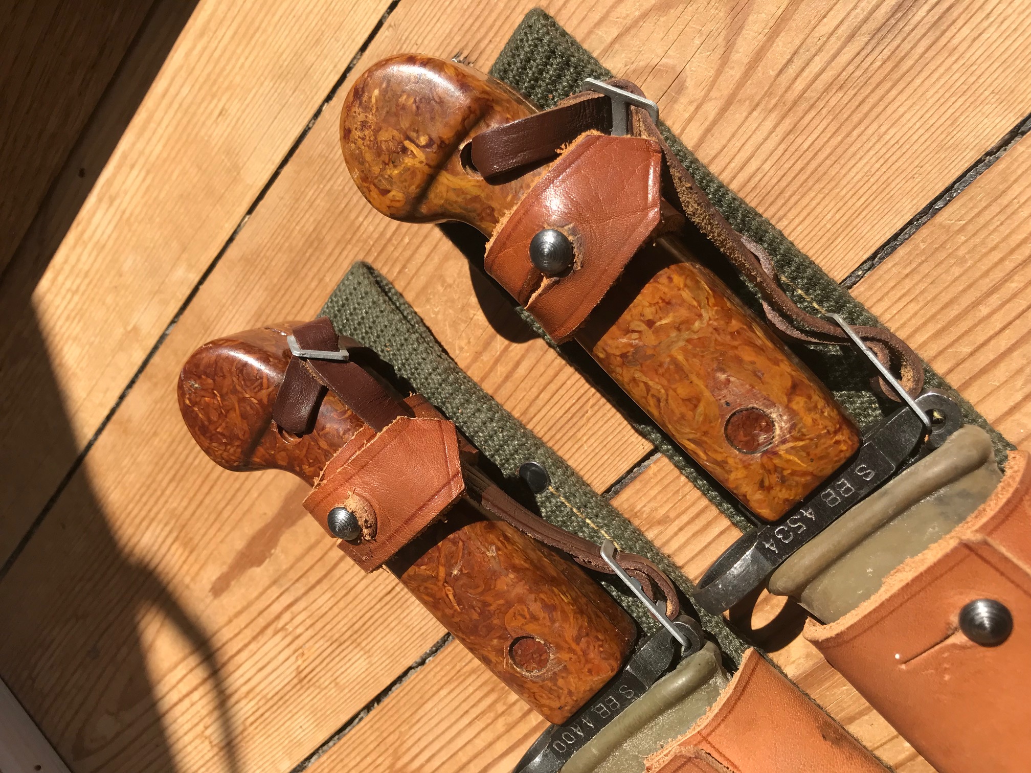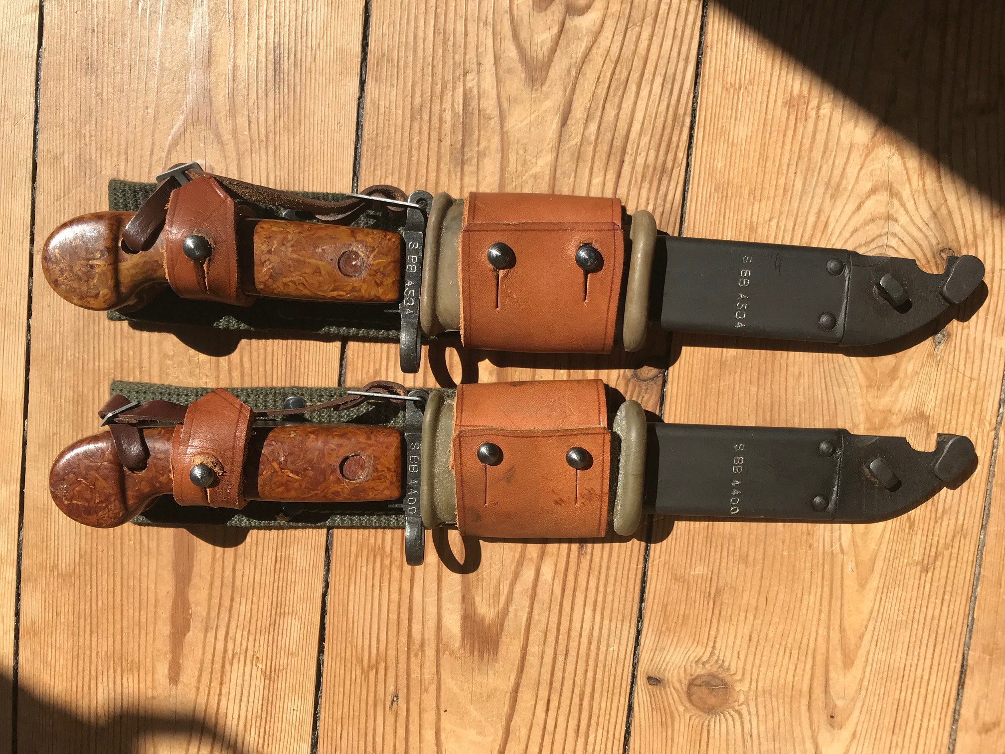 These are romanian 6x3 bayonets with the more uncommon yellow grip. They both came with the green canvas frogs and they are both matching numbers and appears to be new in apperance.