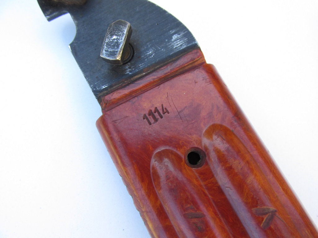 The differences I see between the two are the S.A. one is of earlier production (with grip mold # "1/1"). The grip is a very dark red color, too. The scabbard bears the CUGIR arrow-in-triangle marking on the reverse side. Lastly, the press-stud has a very good fit and the two flats on top of the steel pommel are quite squared off. On the example I pictured here (5854), grip mold # is "3/2". Both flats have a slight bevel from front to back, on the outer edges. There is also a gap at the top of the cut-out for the catch stud (left side). Looks like the top of the stud is a bit shorter rather than the cut-out being oversized. Don't know if this was due to sloppy machining/assembly or more play engineered into the catch.