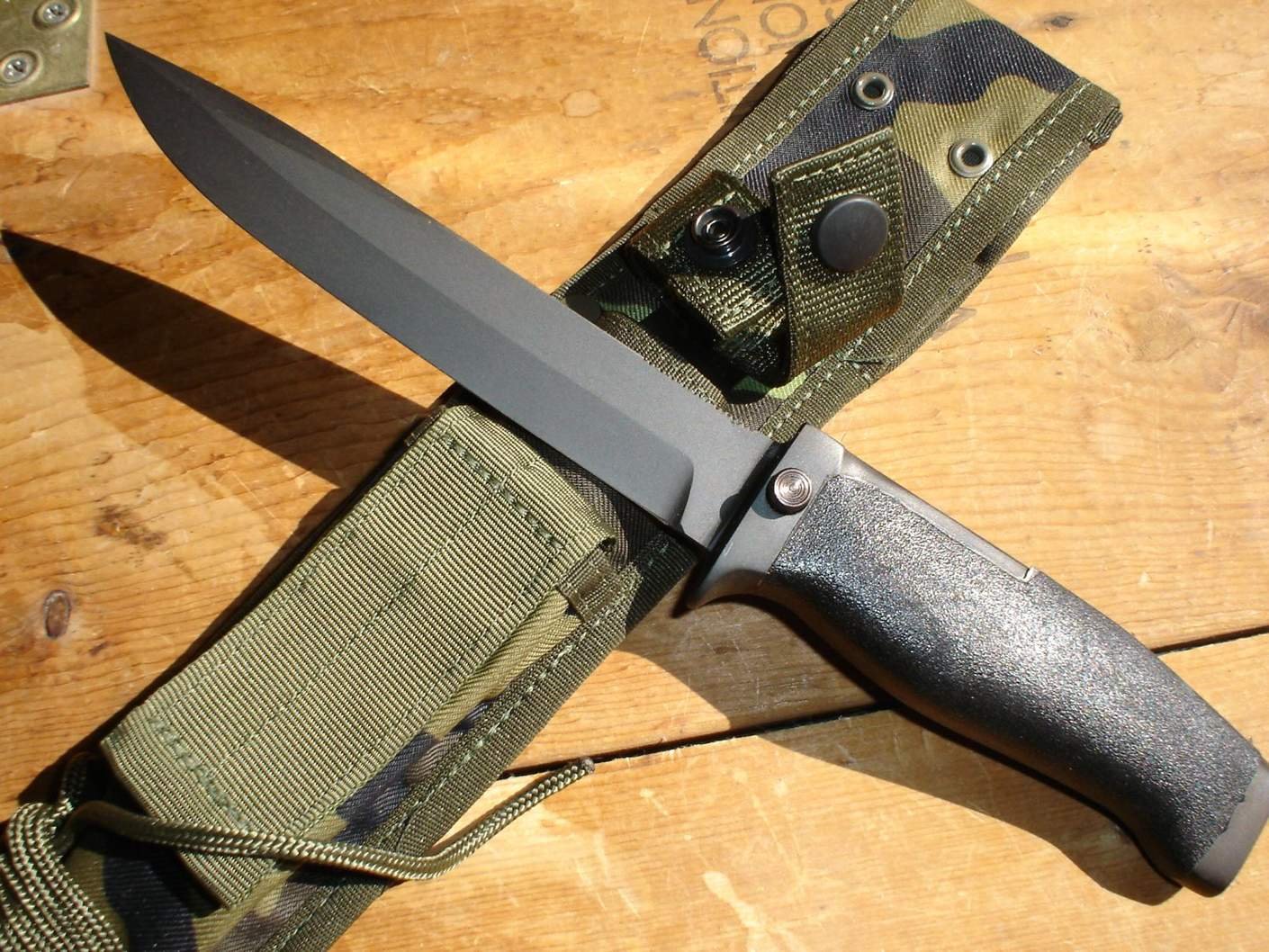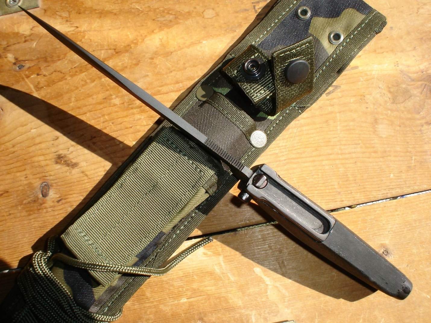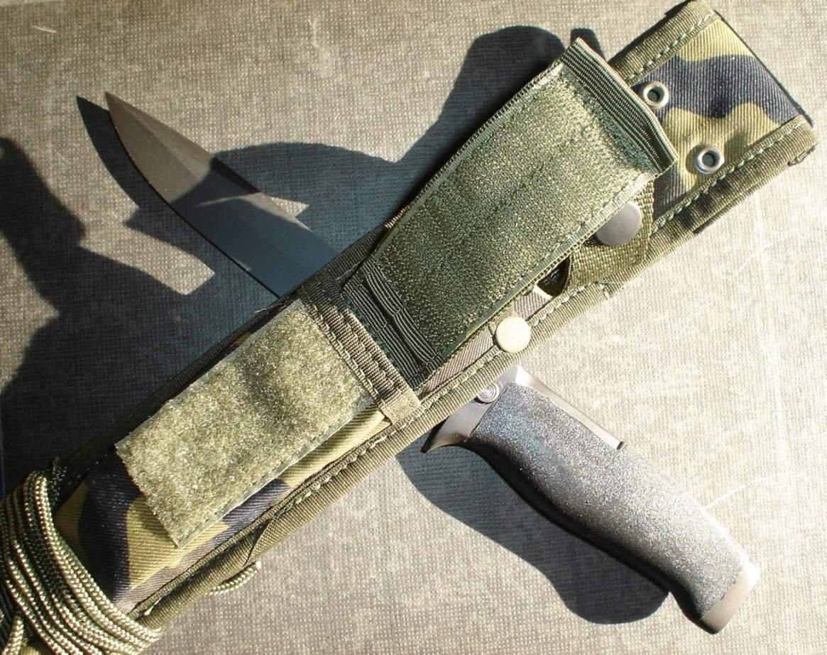 Here are a few more pictures I found. Several different variations with scabbards. Green, camo and black. Also note the small section of saw teeth on the top edge. Mike