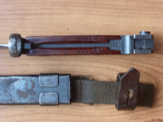 Very nice with an interesting history. The original theory that the different colors of the webbing indicated a difference in whether the bayonets were for internal use or for export. To me that did not seem logical and I have seen both green and tan web hangers come from various sources, both from veterans and importers. The North Koreans manufactured large quantities of these bayonets. They are a relative simple and inexpensive item to make, especially the scabbard, so why would they bother to make a color difference to differentiate between what they issued or exported. Maybe a difference in early verse latter production or just a matter of what color webbing was available at the time?