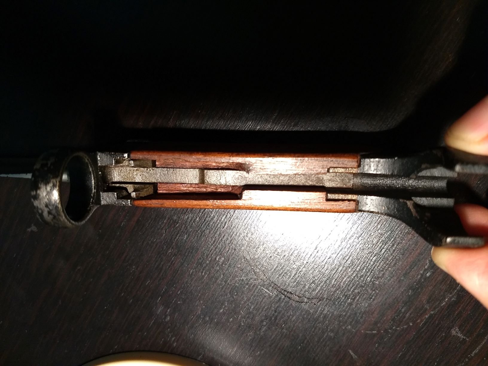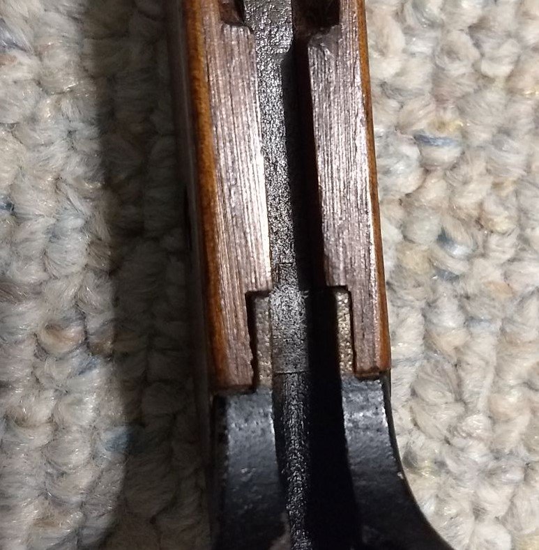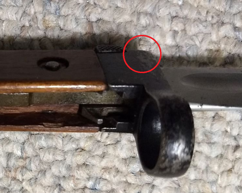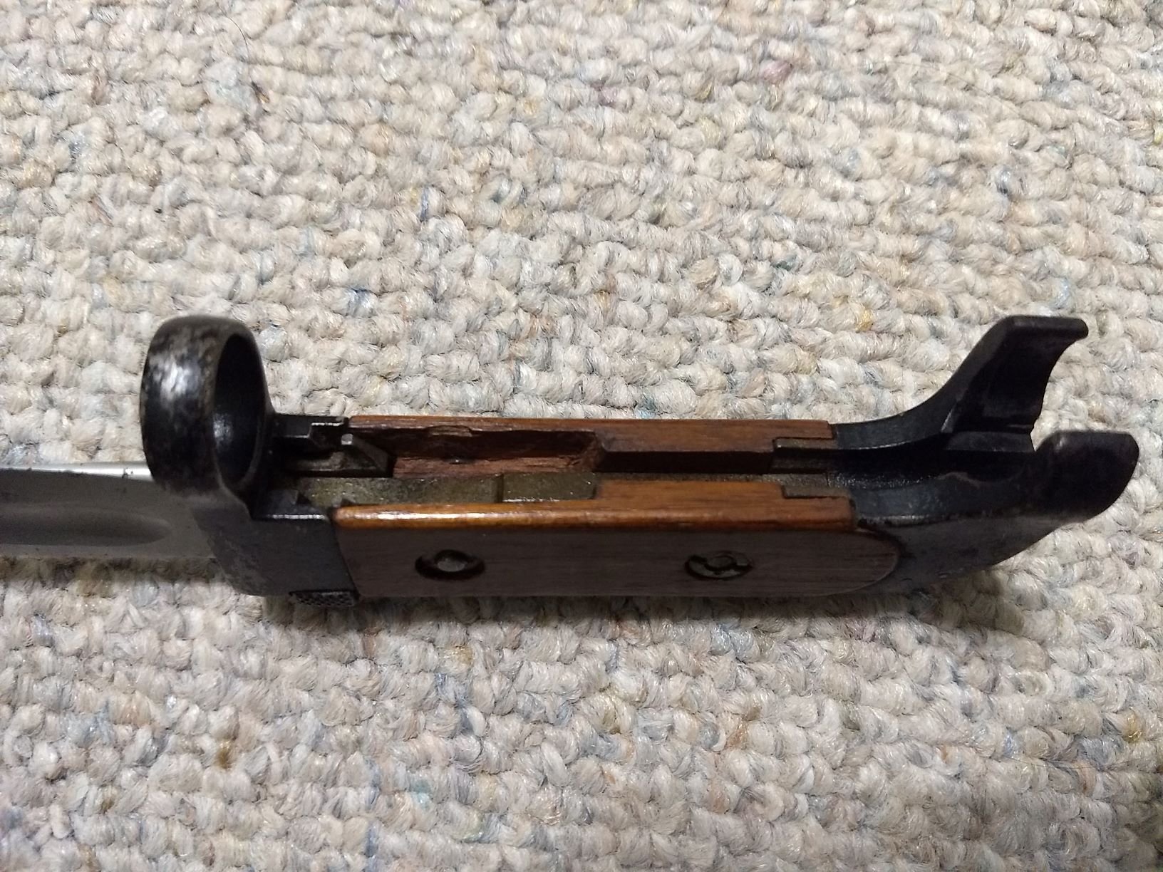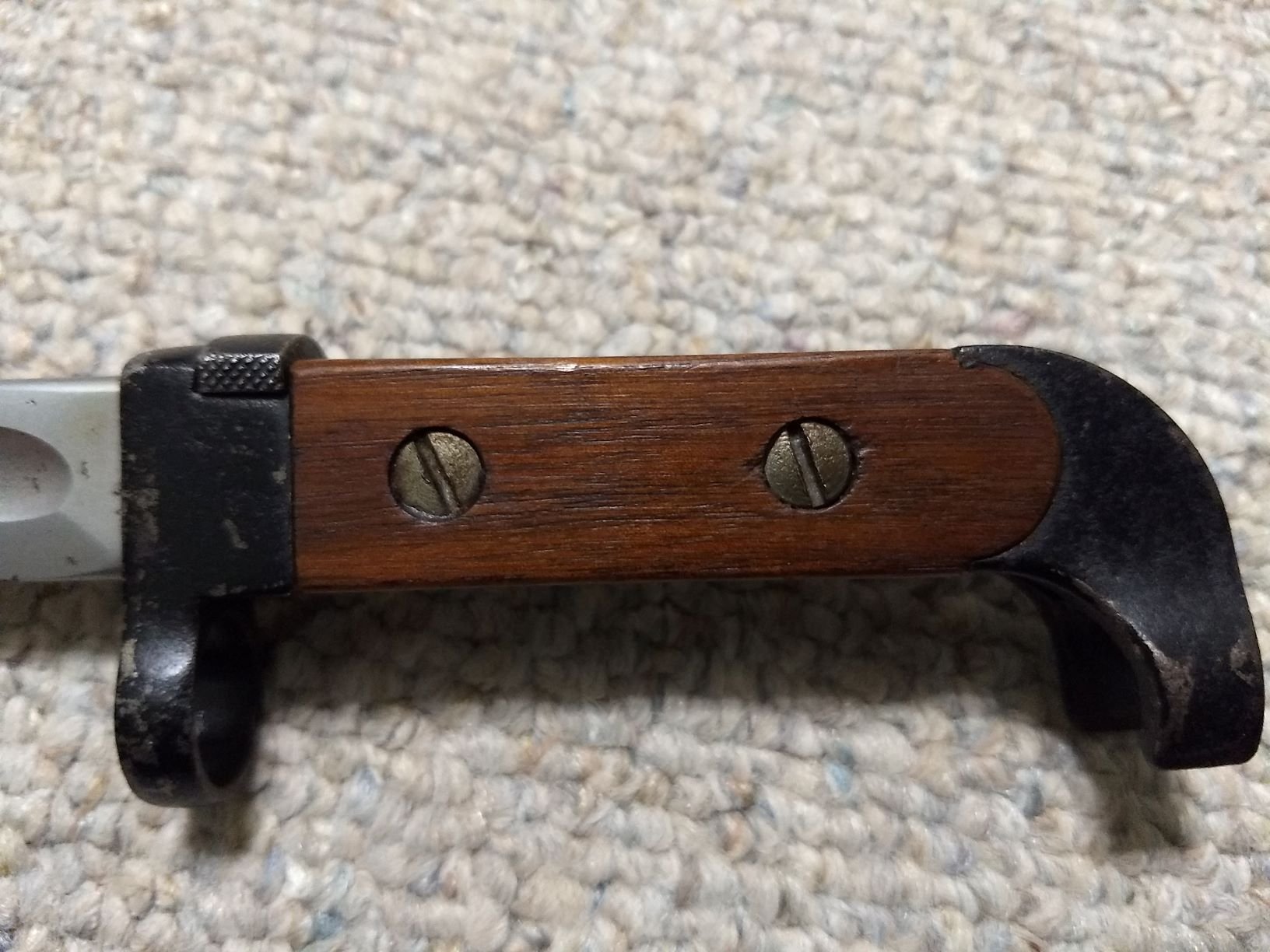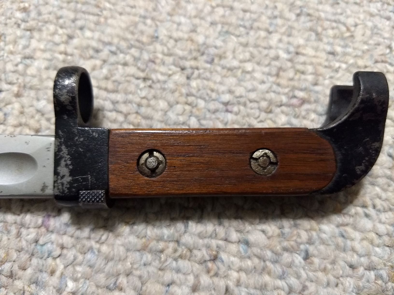 1. The grip panels appear to have been replaced at some time. They do not seem to match the wear and weathering found on the bayonet. Also the finish is missing on the retaining screws. They should be corroded, painted like the other metal parts.