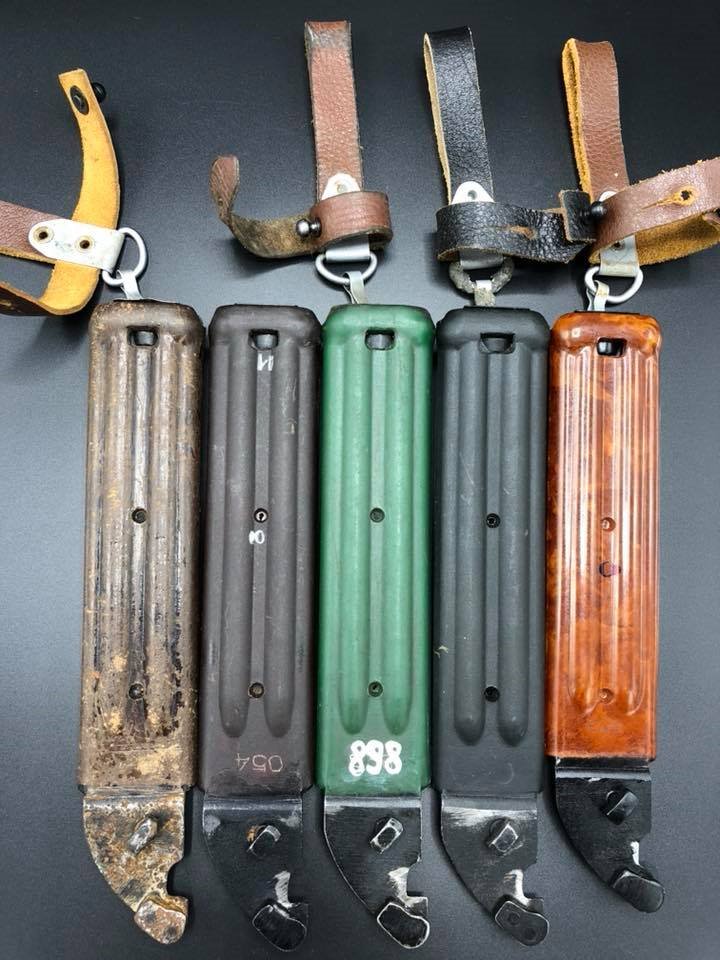 Pictured below are from the Russian reference. On the left is a standard 6x4 scabbard. The middle one is the LONG 6X4. note that the interior is still for the 6X4 bayonet and the 6X5 will not fit. On the right is the standard 6X5 scabbard.