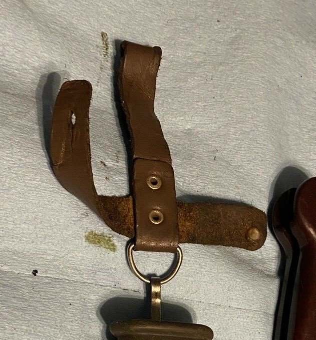 A friend in Poland recently sent me a picture of a snap hook hanger and asked what it was. I had remembered seeing this variation in the past, but had no information as to what it was. I found more pictures online of a similar hanger with a plastic or nylon, (synthetic?) hilt strap post. These pictures were of a reworked Russian AKM 6X3 Type I bayonet and scabbard the looked correct. I have seen similar all leather hangers with metal, (brass and steel) posts and have some in my collection. Has anyone else noticed these variations with the plastic posts or other hangers? The top picture is from my friend. The rest were on eBay. Note the snap hook is grooved on the back similar to the East German ones. Mike
