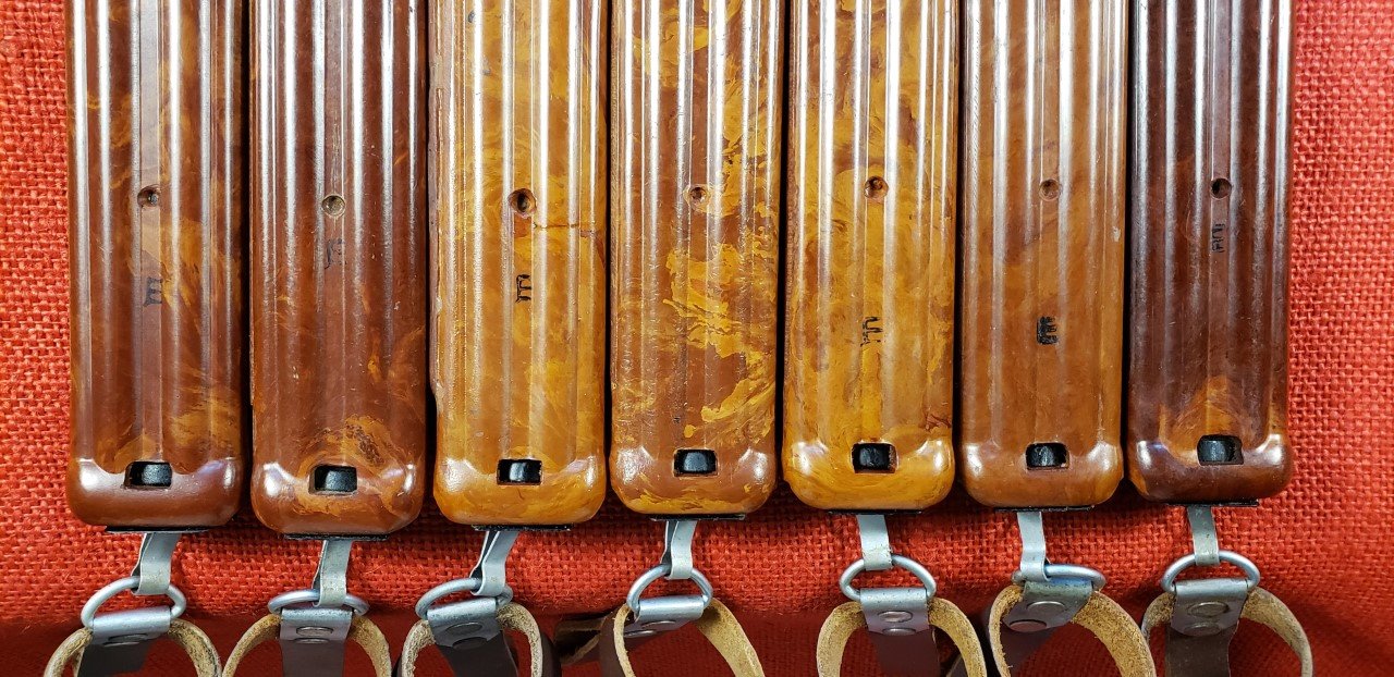 The Bulgarian AKM 6X4 Type II bayonets and scabbards display simple and consistent hand stamped paint or ink markings. These can be from manufacturing and assembly inspection or from military acceptance. I believe the white paint oval OTK and possibly the "K" are military acceptance marks similar to their Russian counterparts. The early scabbards with the flush ground welds on the cutter plate are found with a white "K" on the cutter plate stop and a separate OTK on the lower scabbard body. On later versions the was simplified to just the OTK on the cutter plate stop. Note the two later versions pictured have the hand etched matching numbers on the cutter plate. This is unusual and similar to numbering found on some Yugoslavian akm scabbards. Mike