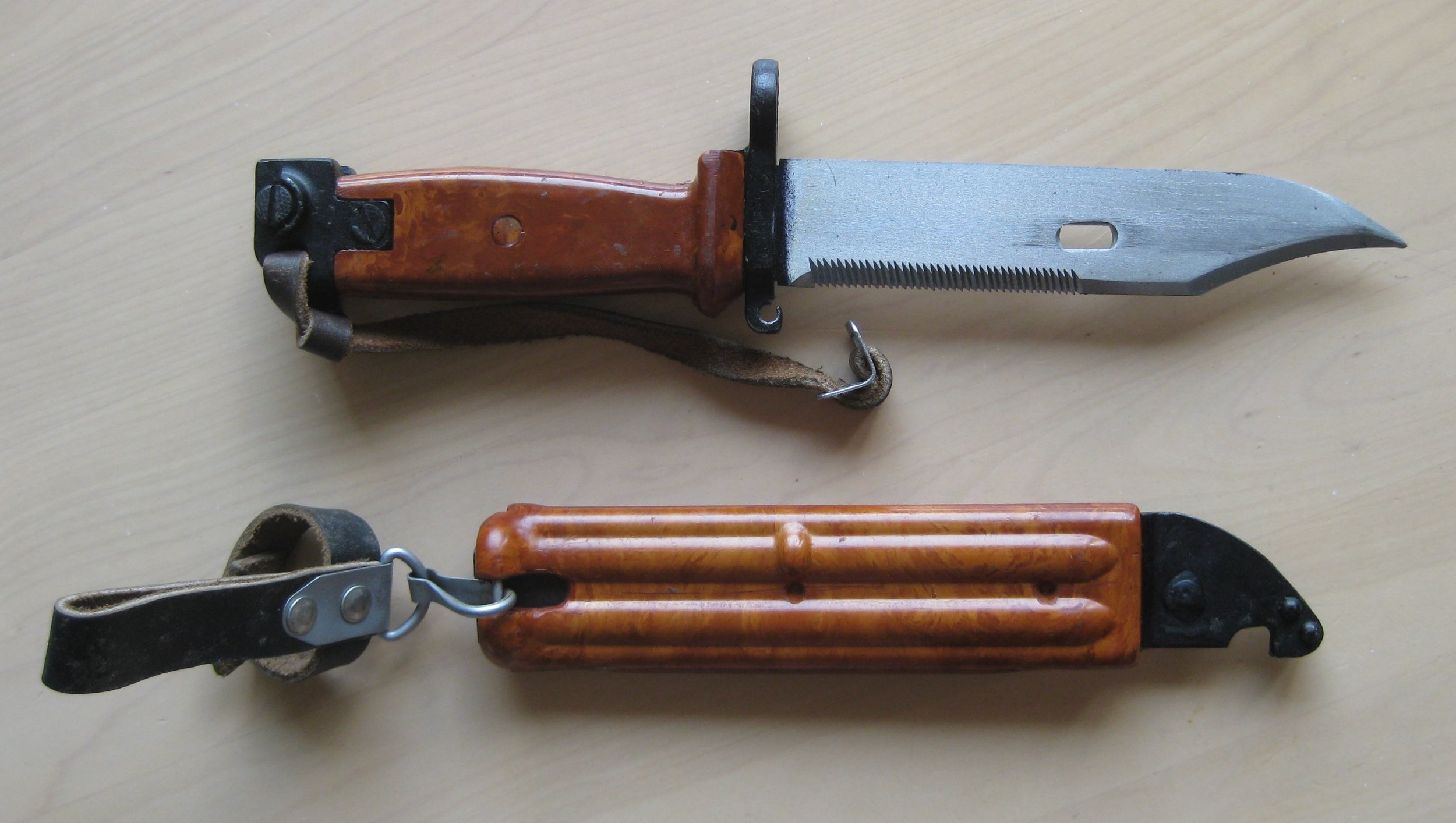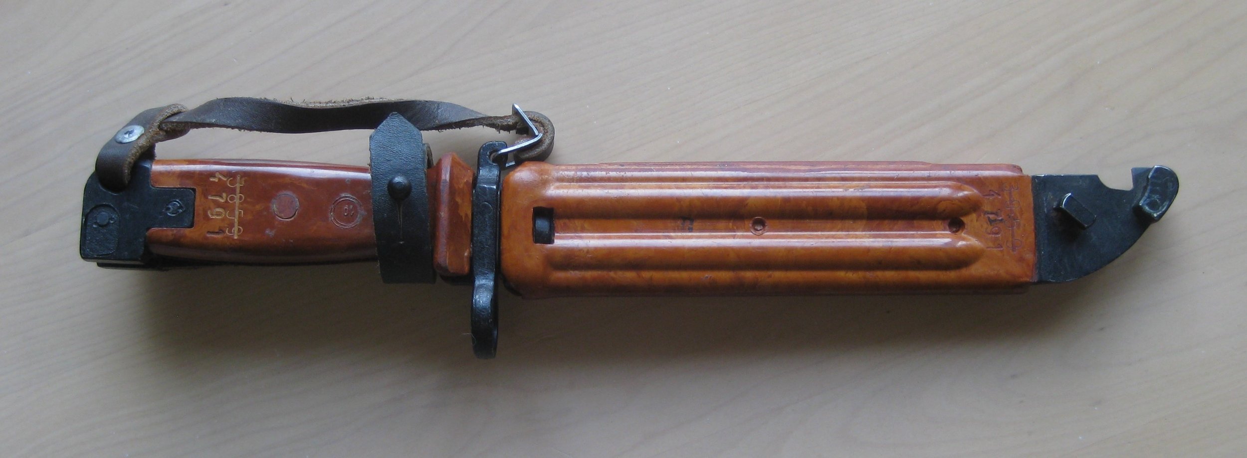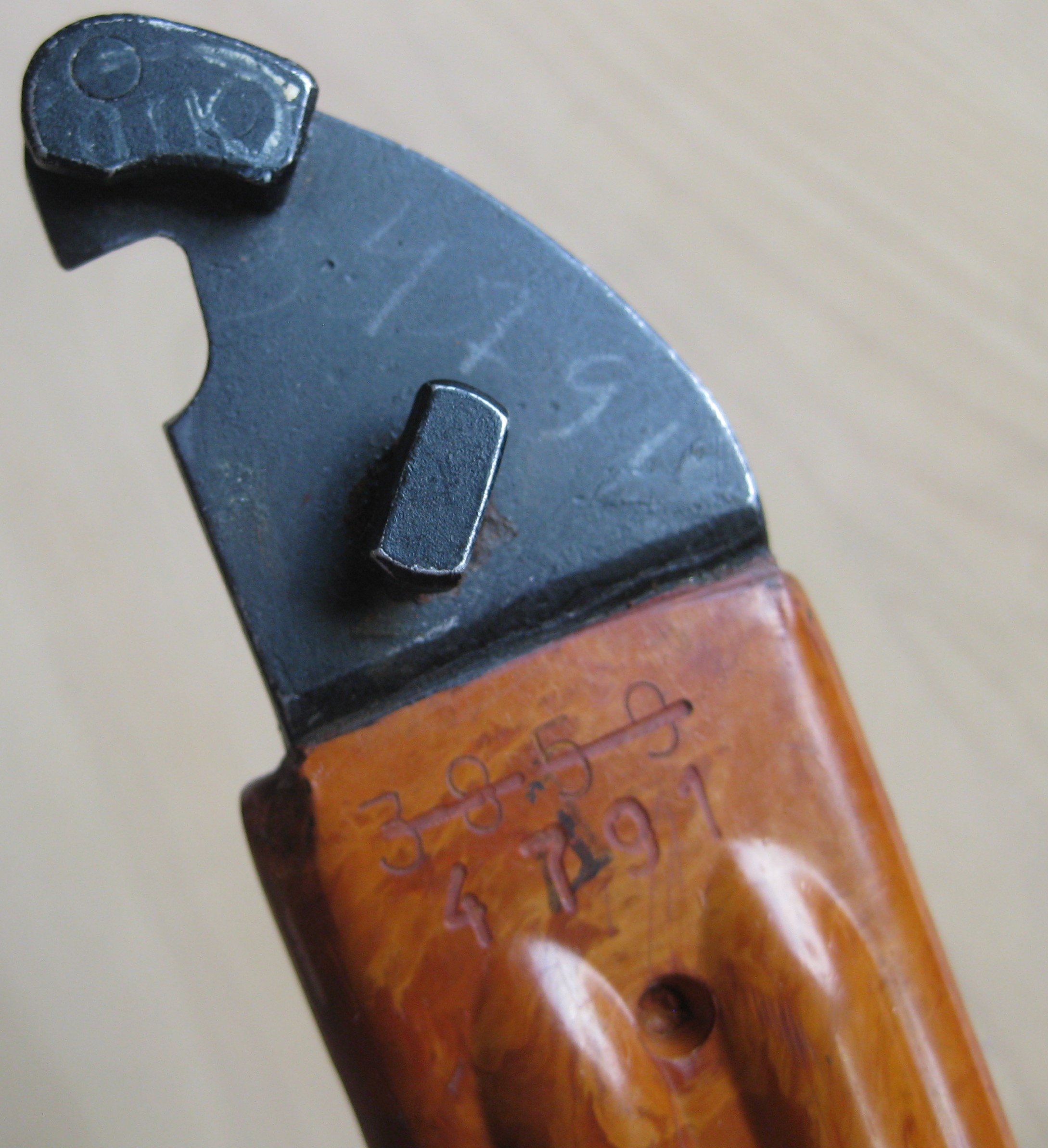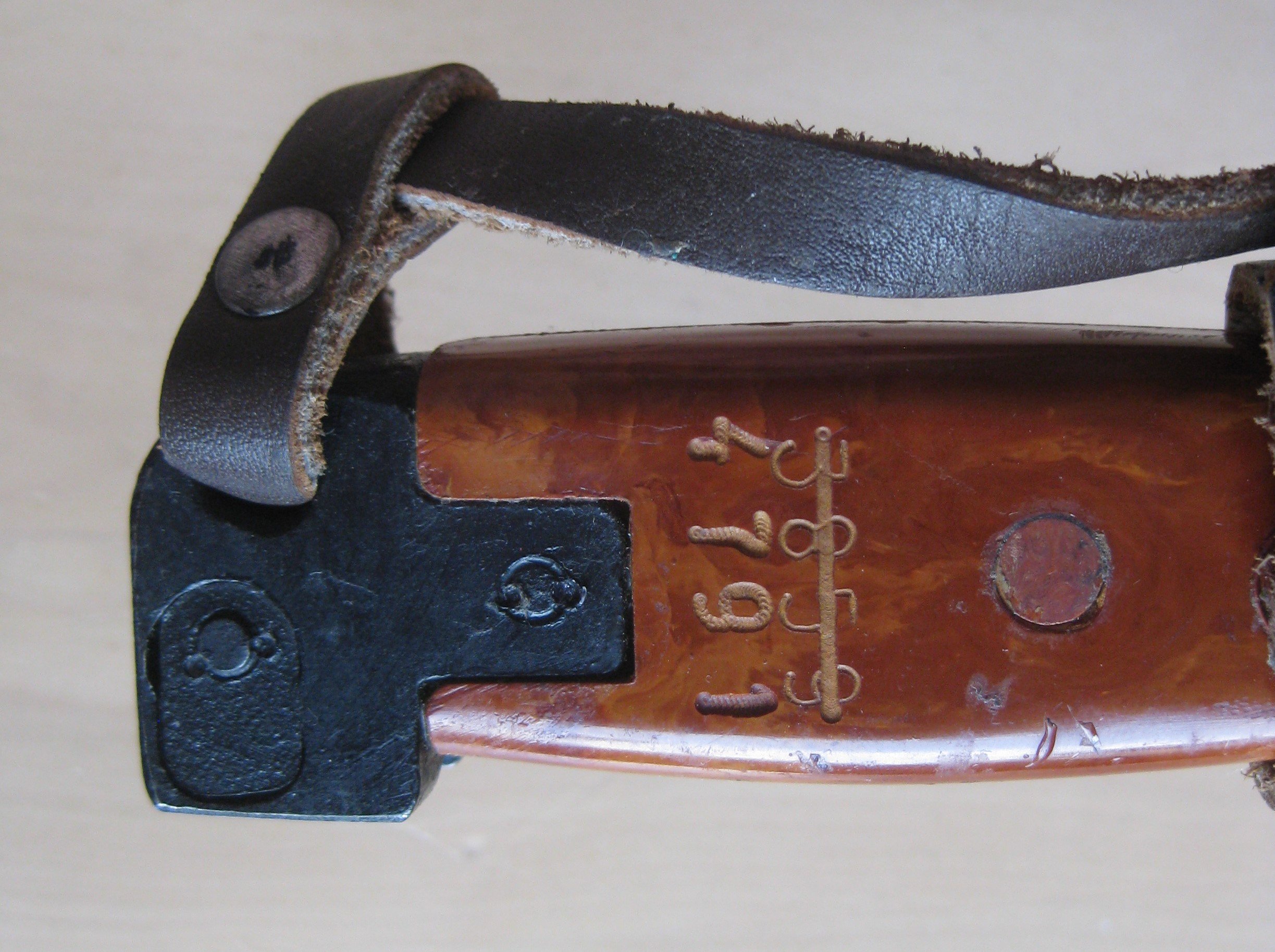 The bayonet and scabbard above were originally matched to an AKM rifle with a serial number ending with 3859. For some unknown reason it was turned in. It would have then been inspected and approved for reissue as needed. This could have been at the time the new AK74 rifles were replacing the AKMs in front line service. This bayonet may well have been matched with a different reconditioned AKM rifle, (last 4 numbers 4791), for reserve storage or reissue. The numbers are original in style and placement. It may also have been reissued to one of the new AK74 rifles. They fit and for some reason Bulgaria was slow in producing the new AK74 6X5 bayonets and scabbards. They even went so far as to paint reworked 6X4 bayonets black to match the new rifles and bayonets. They also bought surplus East German AKM 6X4 Type II bayonets and scabbards to renumber and issue with their new AK74 rifles rather than making more bayonets.
