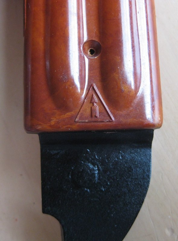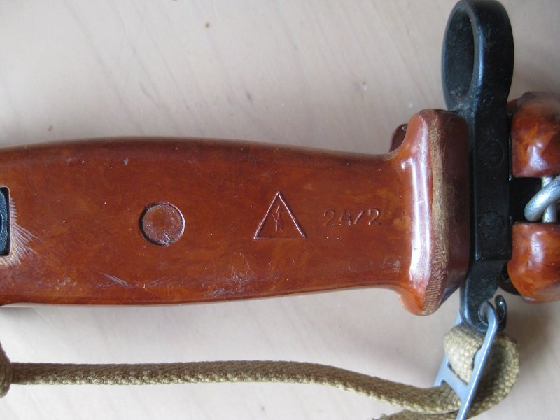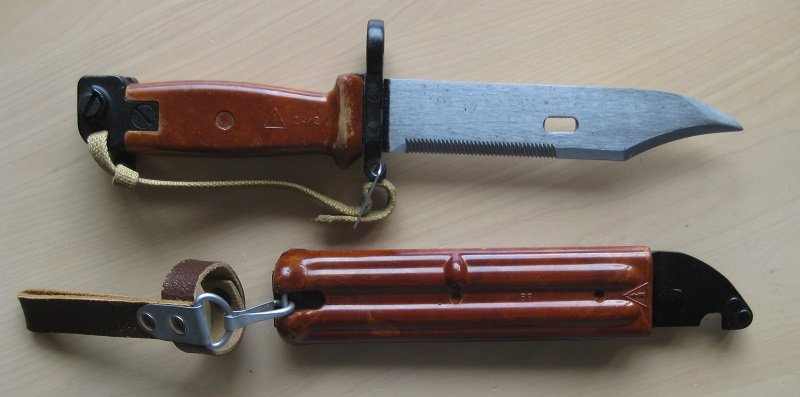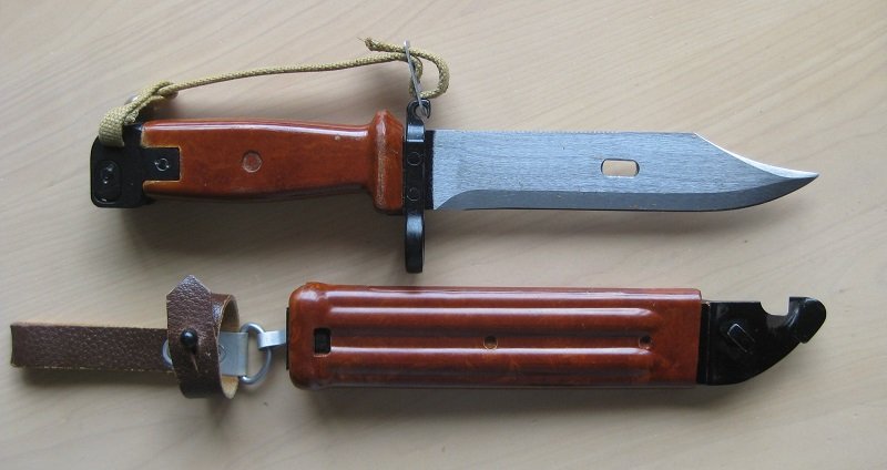 This is an excellent example of a Russian AKM 6X4 Type II bayonet and scabbard made by the Izhevsk Arsenal. These bayonets can be identified from early to late production by the placement of the arsenal mark. The triangle on the side of the grip indicates this is a step 3 out of 4. The hanger and hand strap appear to be correct / original as well.