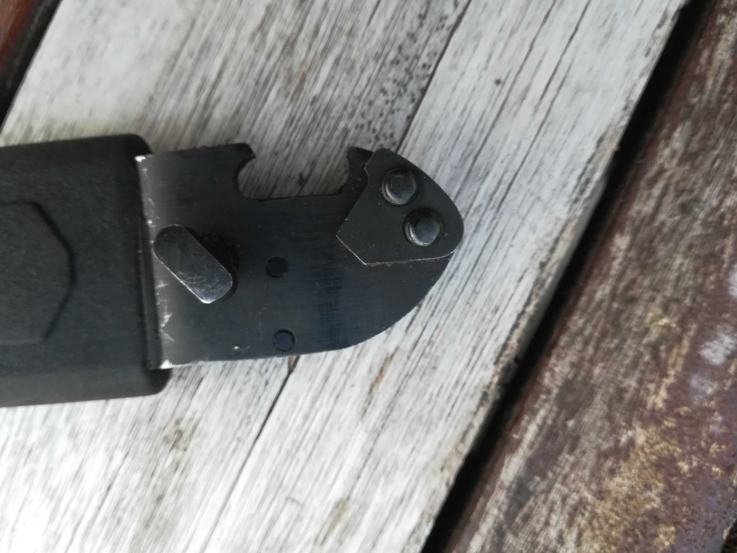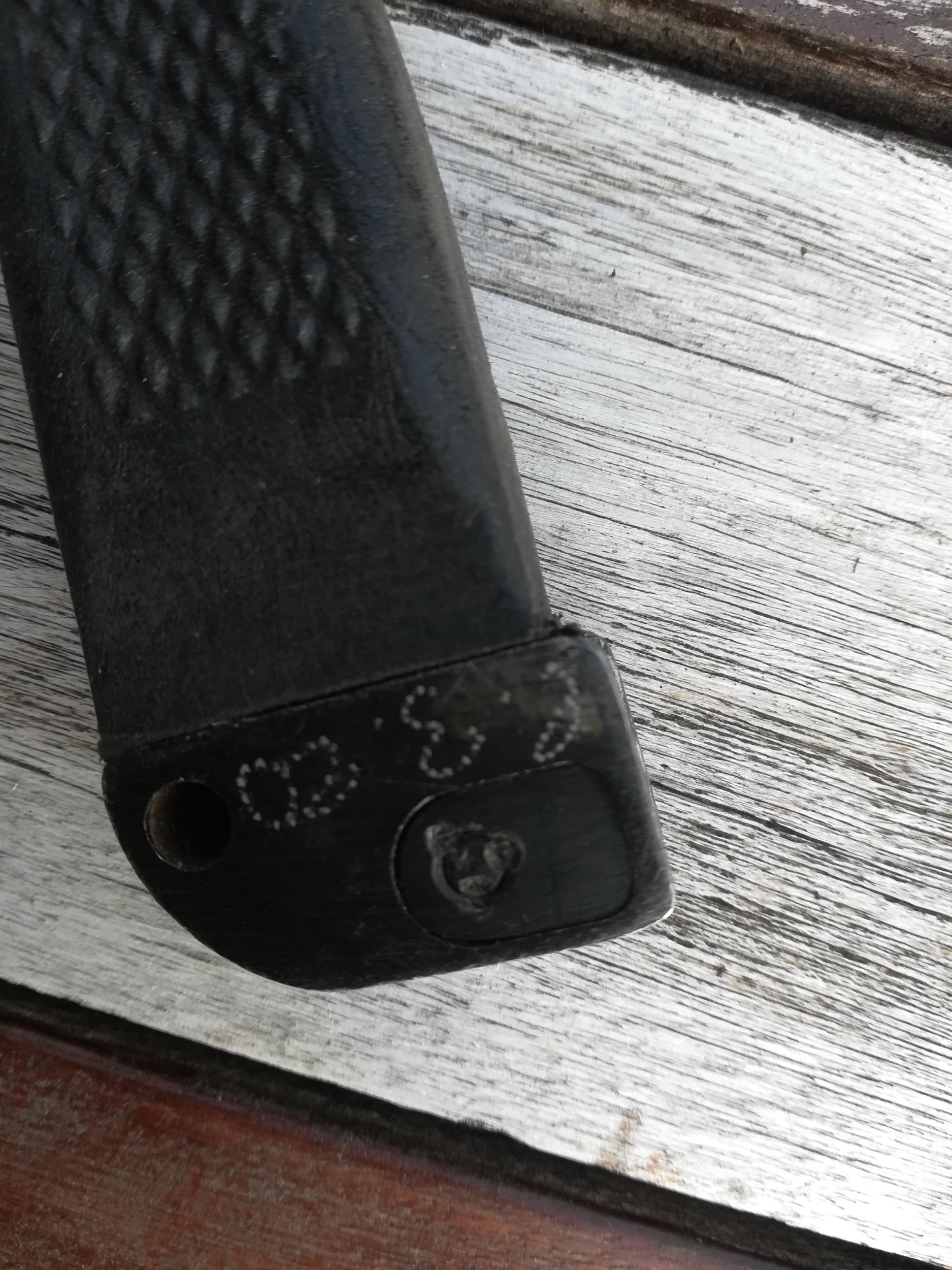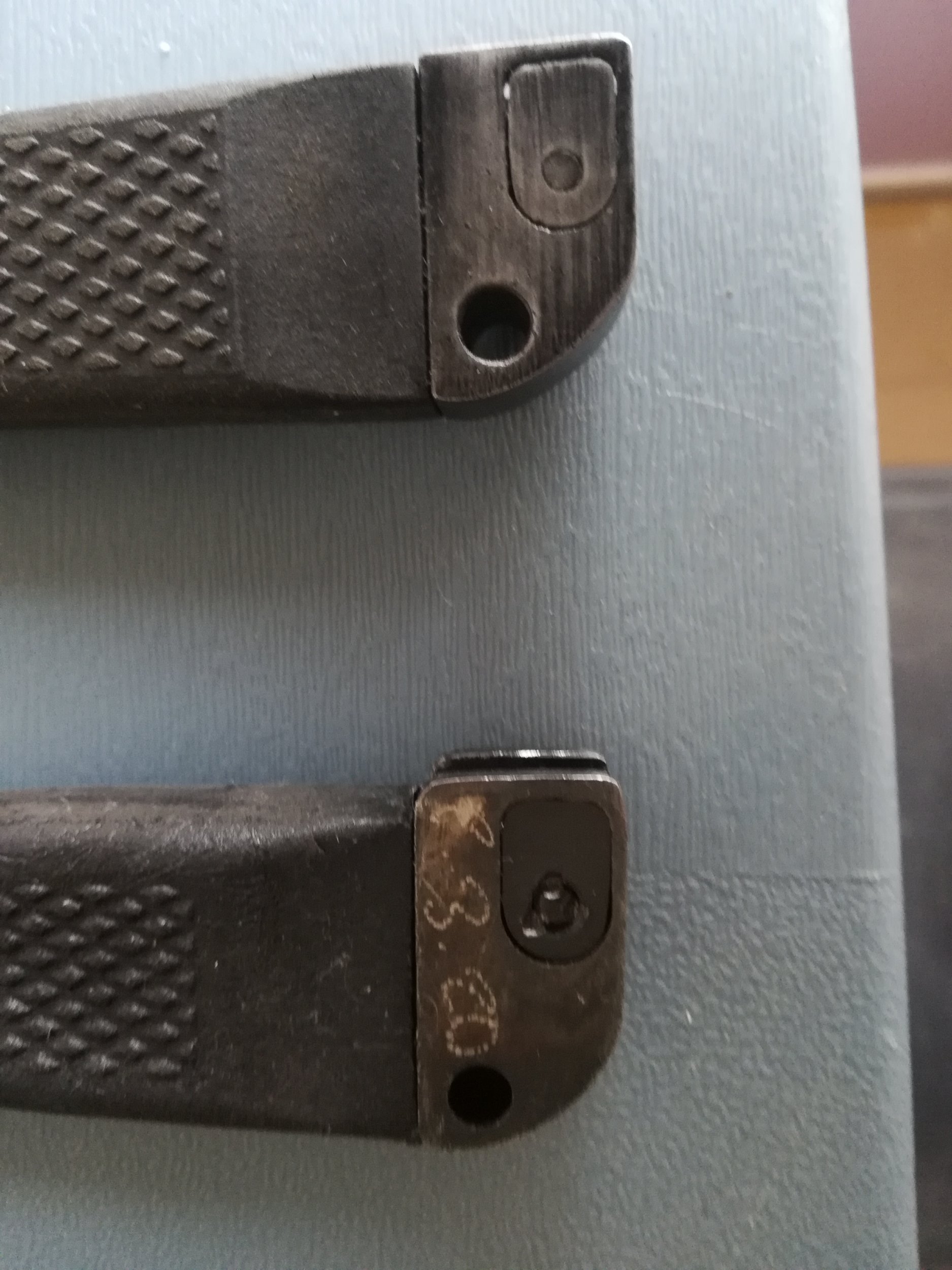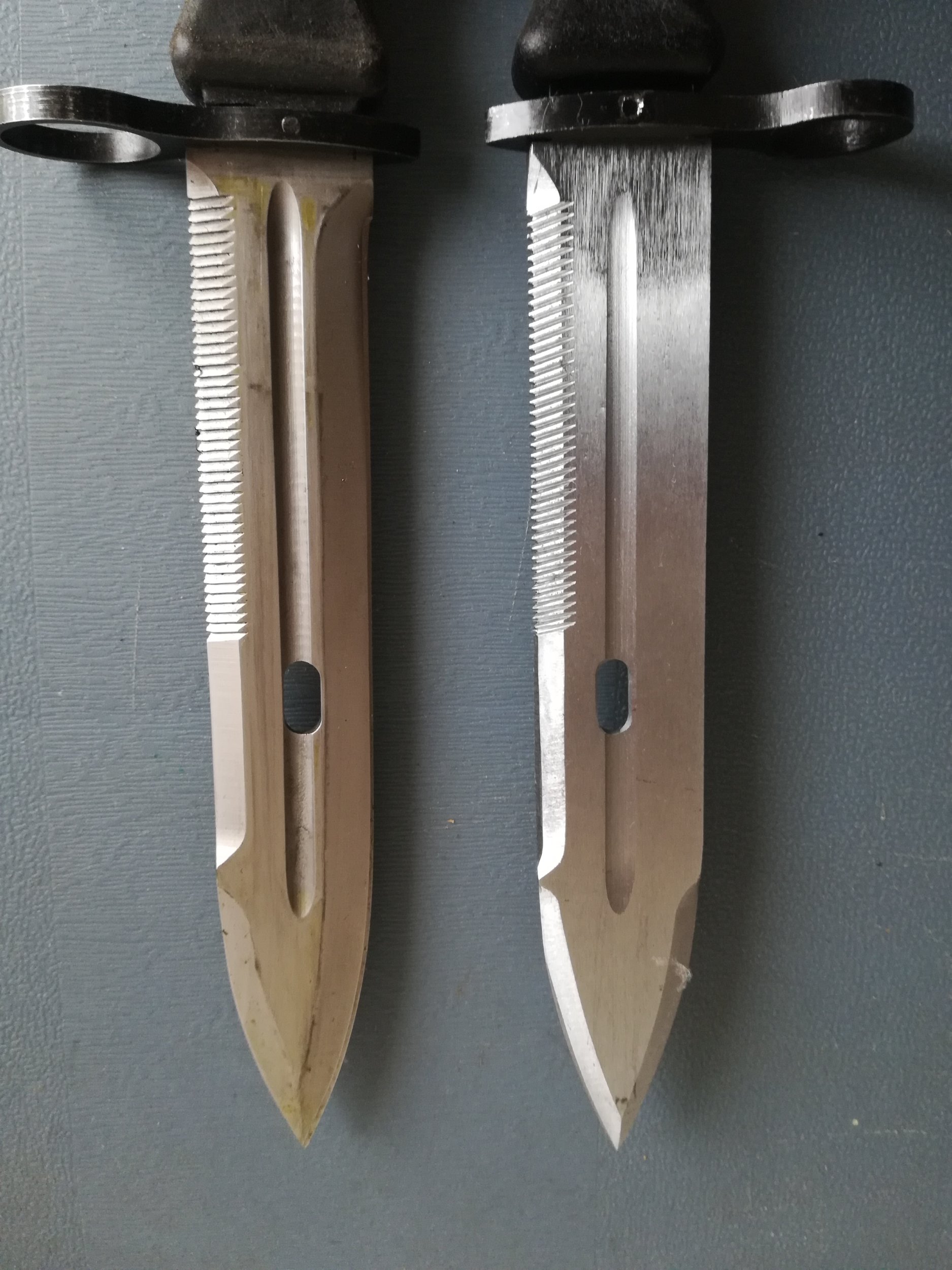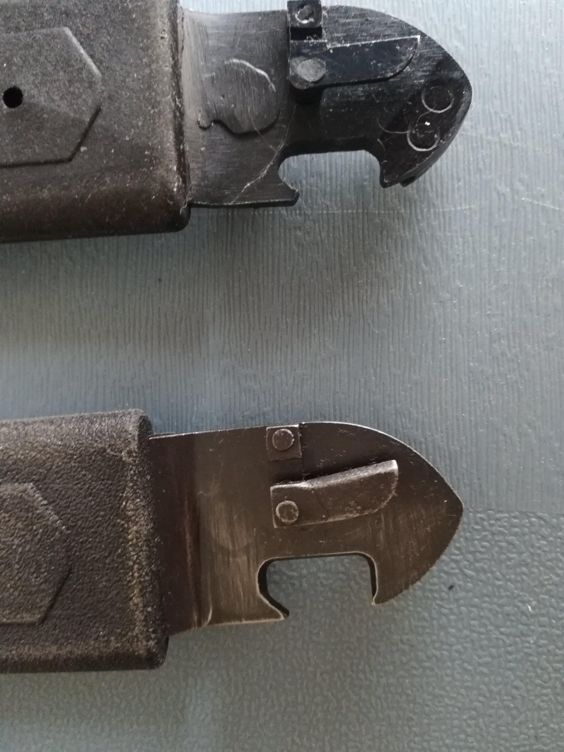 I made a comparison between this model and the commercial version. You will observe that the handles are different (shapes and rivets). The blade is not fixed in the same direction, moreover it has a shape which is not identical. Finally, on the end of the scabbard of the commercial version, there is no sign of manufacture (welding, riveting).