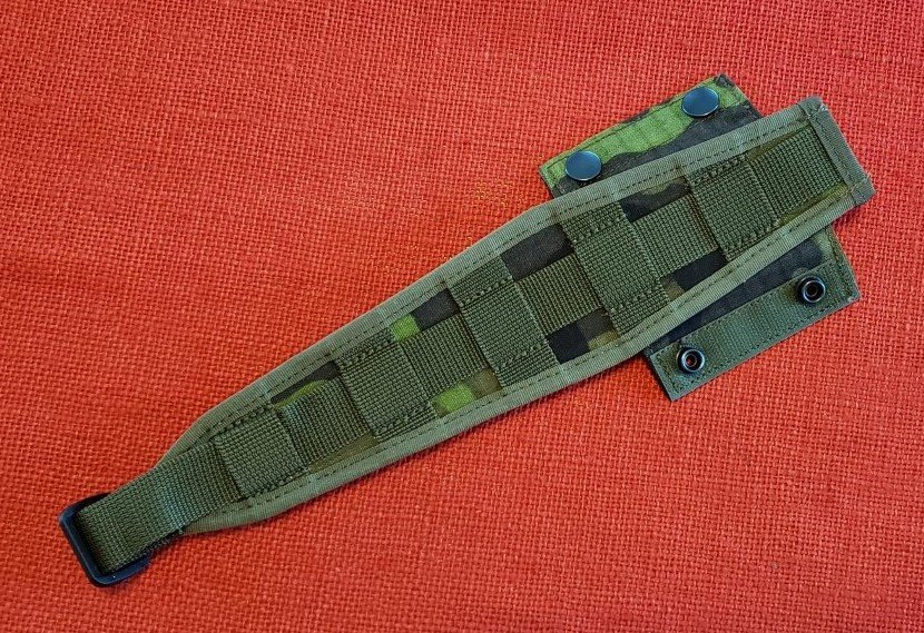This finally came in the mail today. It is a Slovakian scabbard for the Czech VZ58 rifle bayonet, The Slovakians have their own uniforms and field gear but still use the Czech VZ58 rifles. It is all fabric and designed to attach to MOLLE gear. The bayonet hilt is secured with a wide flap with Velcro strips and two snap buttons. It is available in various colors and camo.