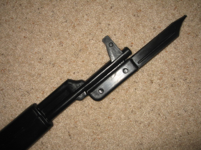 This is a solid, molded rubber training device designed to represent a Polish AK47 rifle with an attached bayonet. It has a metal core and is the correct size and weight to simulate an actual weapon. I am not sure what time period this trainer represents. The molded details are somewhat contradictive. The rifle receiver represents a forged AK47 rifle, but the bayonet has the bowie point of a 6H3, (type I), or a 6H4 (type II).
