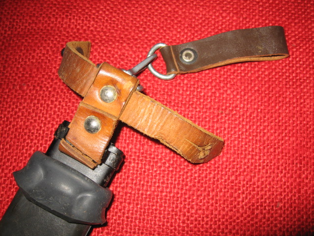 Here's another step in the design of the hangers for the early Russian AKM Type I bayonets and scabbards. This is an example of a Russian two hook style hanger. It uses a stamped metal bracket to connect a snap hook from the bracket to the scabbard and another to attach to the belt loop with a "D" ring. A natural leather hilt loop is attached to the bracket with two rivets. Note that the belt loop and hilt loop rivets have the typical Russian black washers plus Russian style snap hooks. The bayonet and scabbard are both early ones, but have been reworked and have forced matched etched numbers. The bayonet has the early 1st version cross guard with the rounded strap hook similar to the Hungarian ones. The scabbard is the early 1st style with the flat top cutter pivot and the flat bar hanger mount. It was modified during rework by cutting away a small semi-circular piece from the hanger bar to be able to use a snap hook. Also note that the wrist strap on the bayonet is the early 2nd style with two buckles. Mike