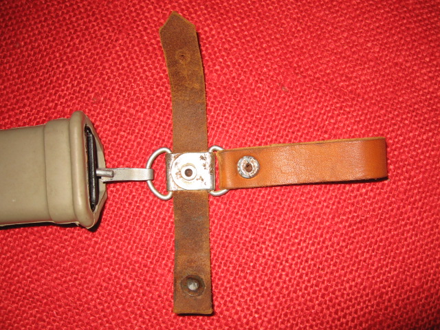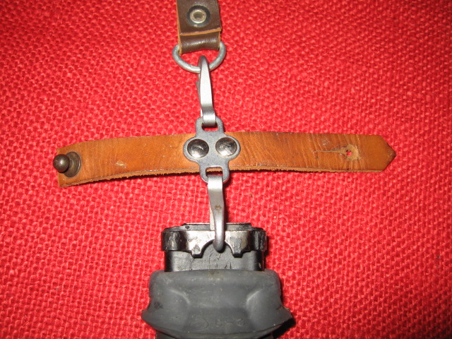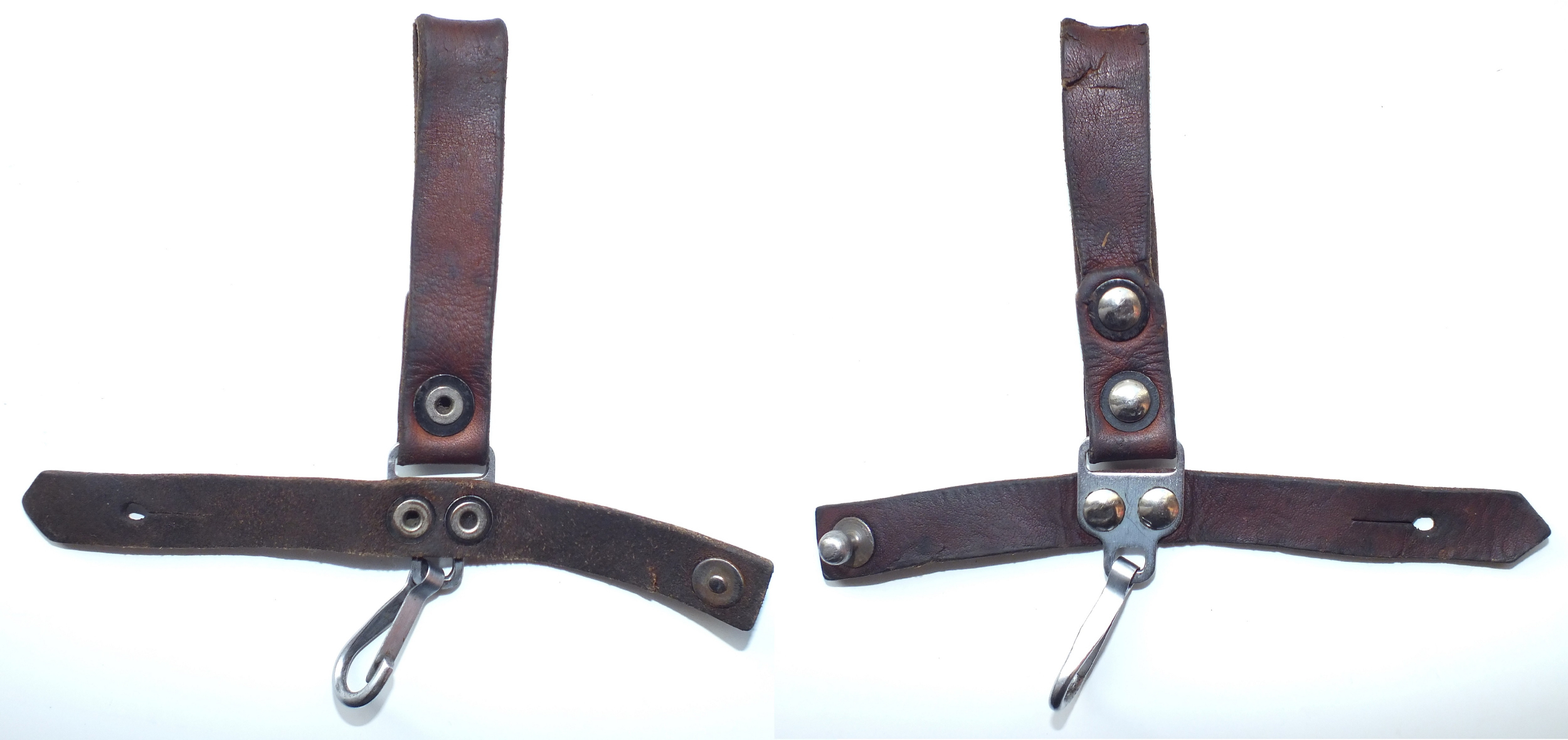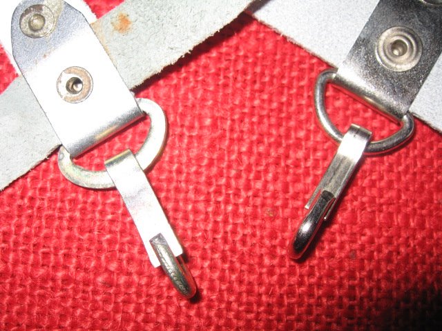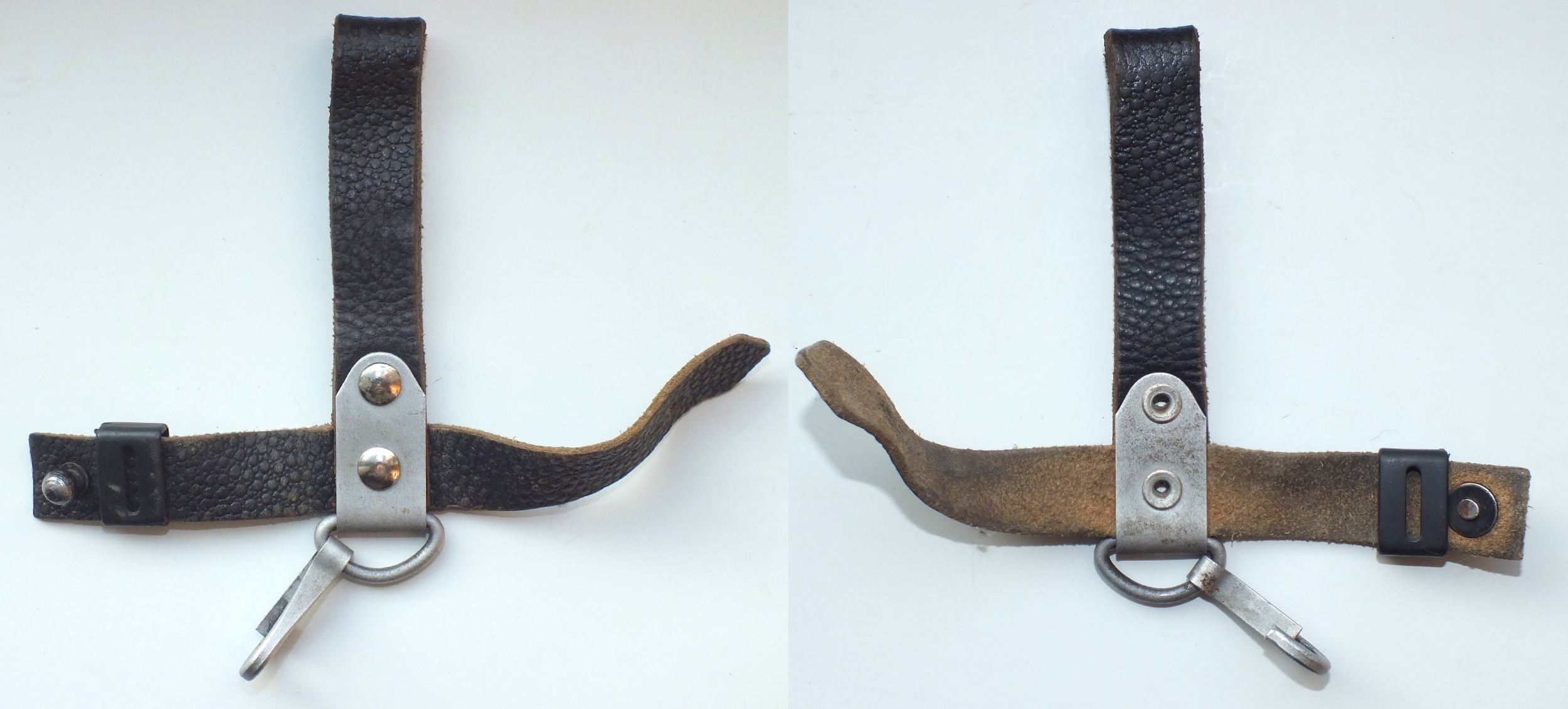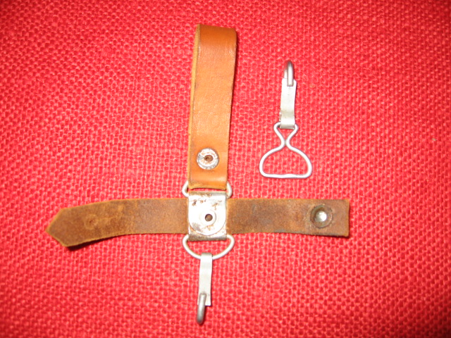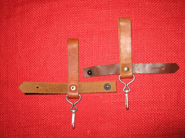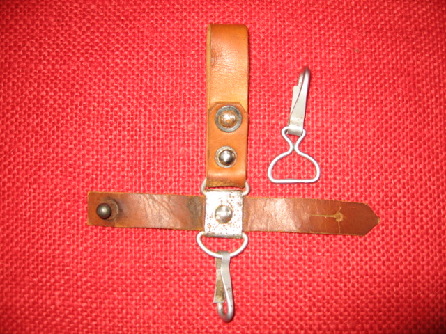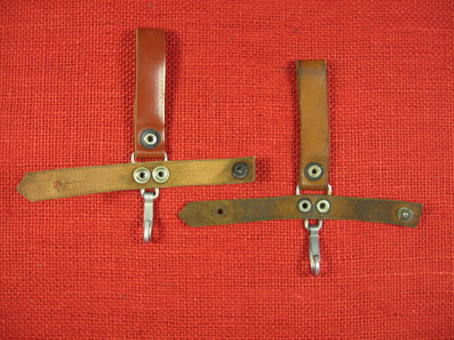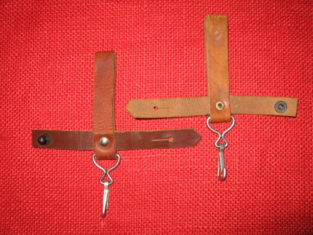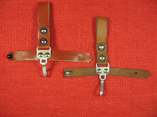 I recently acquired another early style Russian snap hook hanger. This is the variation with the metal bracket and single snap hook. The one I posted previously was made with synthetic (vinyl) leather. This one is real leather and probably the original version. They are pictured here together for comparison. The reddish one on the left is vinyl, the one on the right is leather. Mike