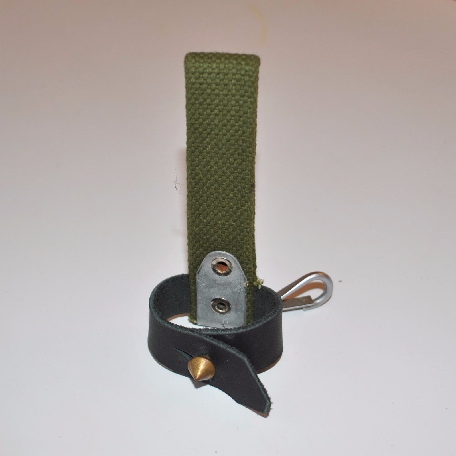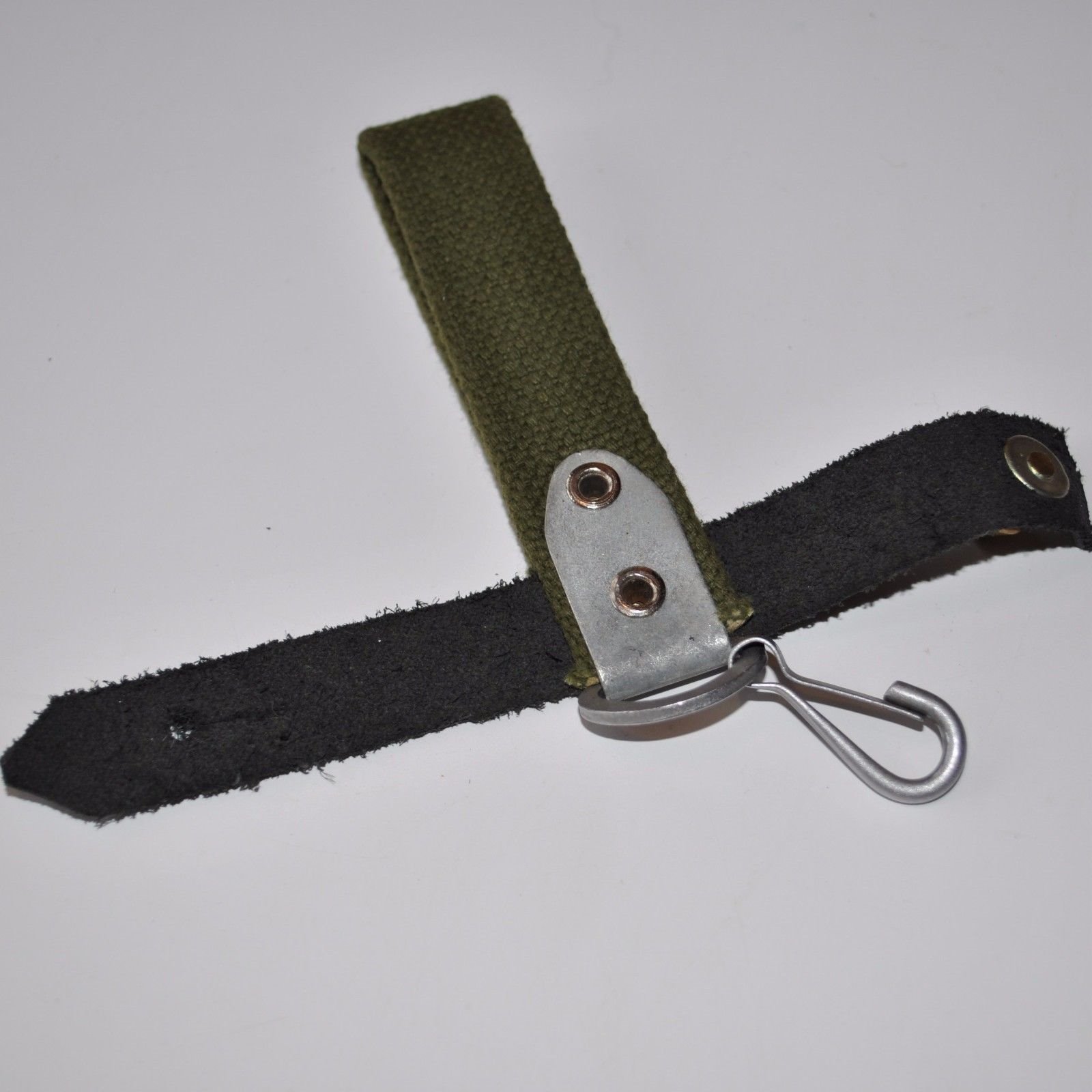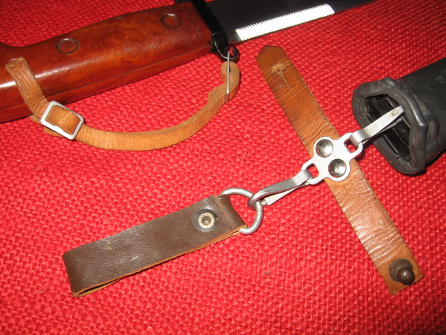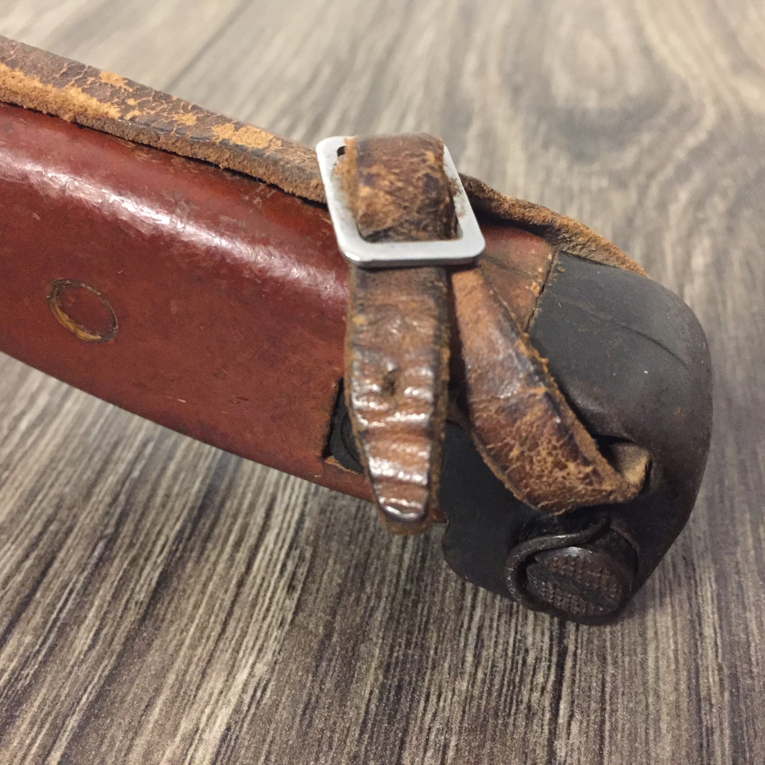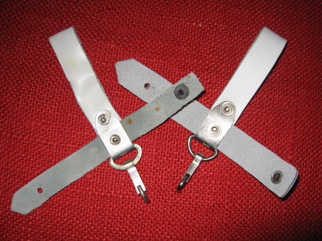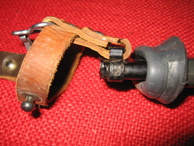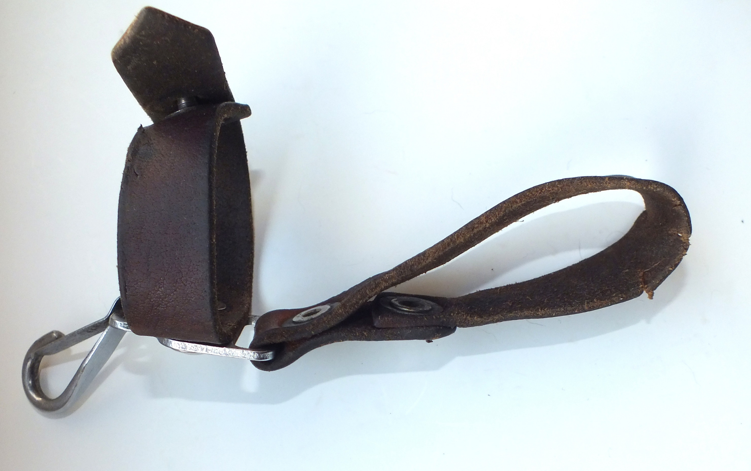 I recently acquired another early style Russian snap hook hanger. This is the variation with the metal bracket and single snap hook. The one I posted previously was made with synthetic (vinyl) leather. This one is real leather and probably the original version. They are pictured here together for comparison. The reddish one on the left is vinyl, the one on the right is leather. Mike