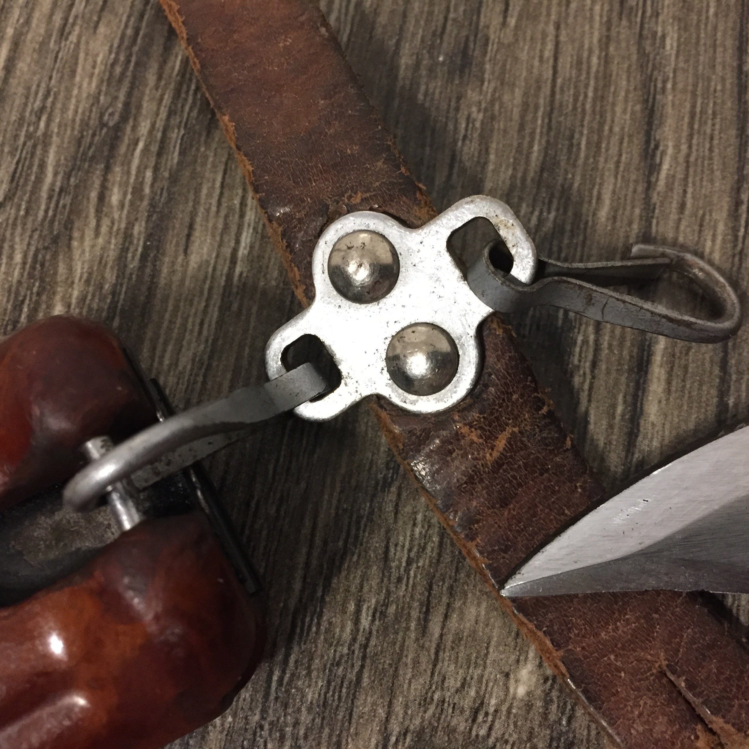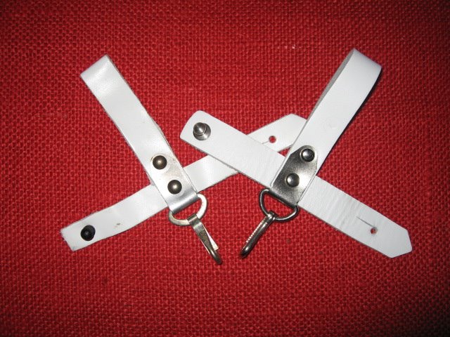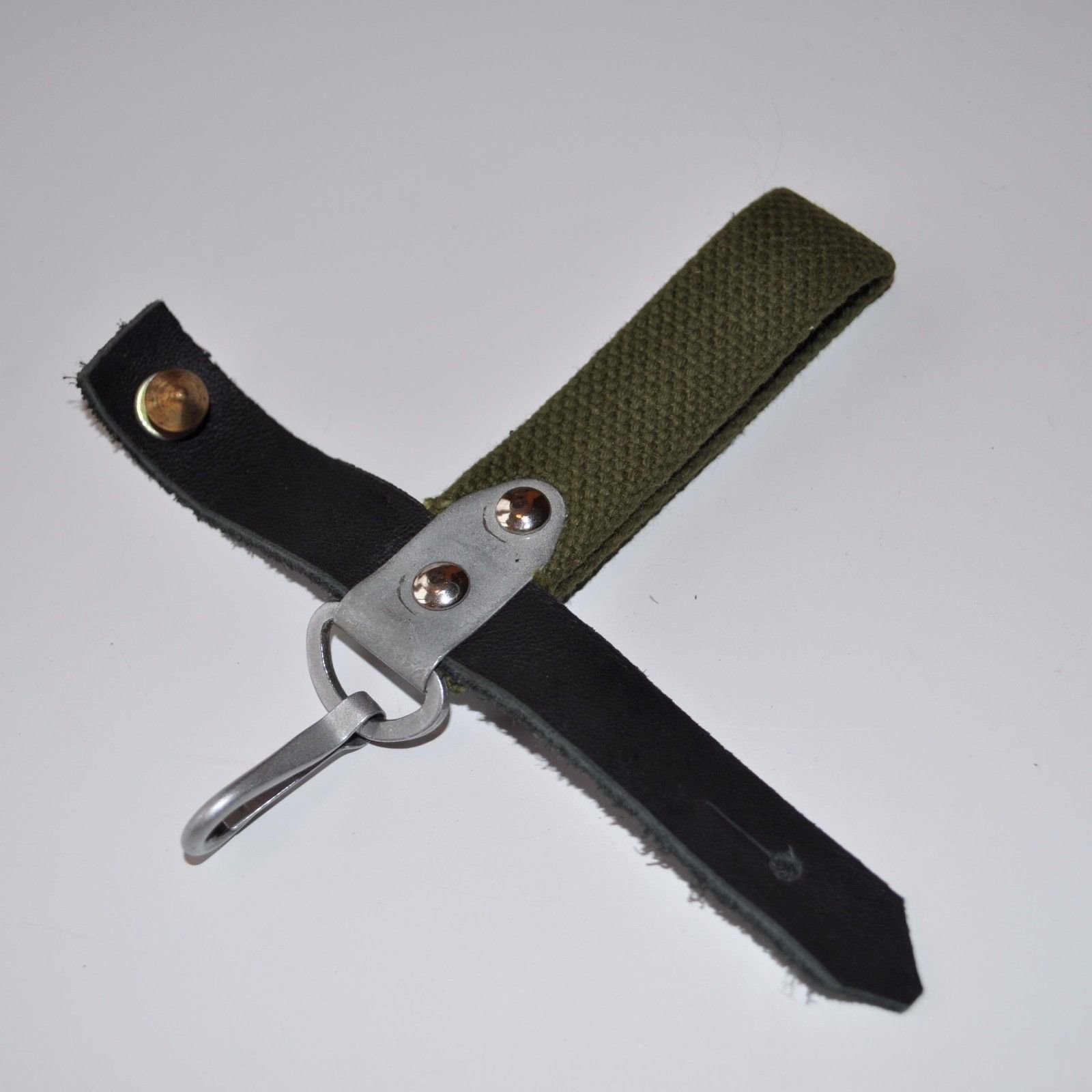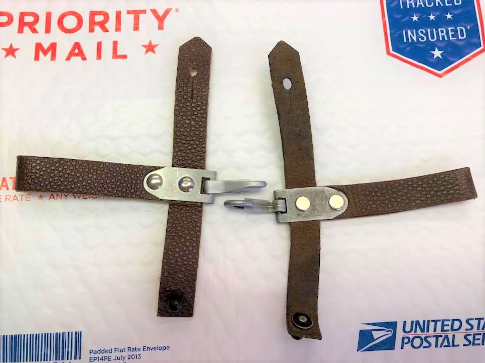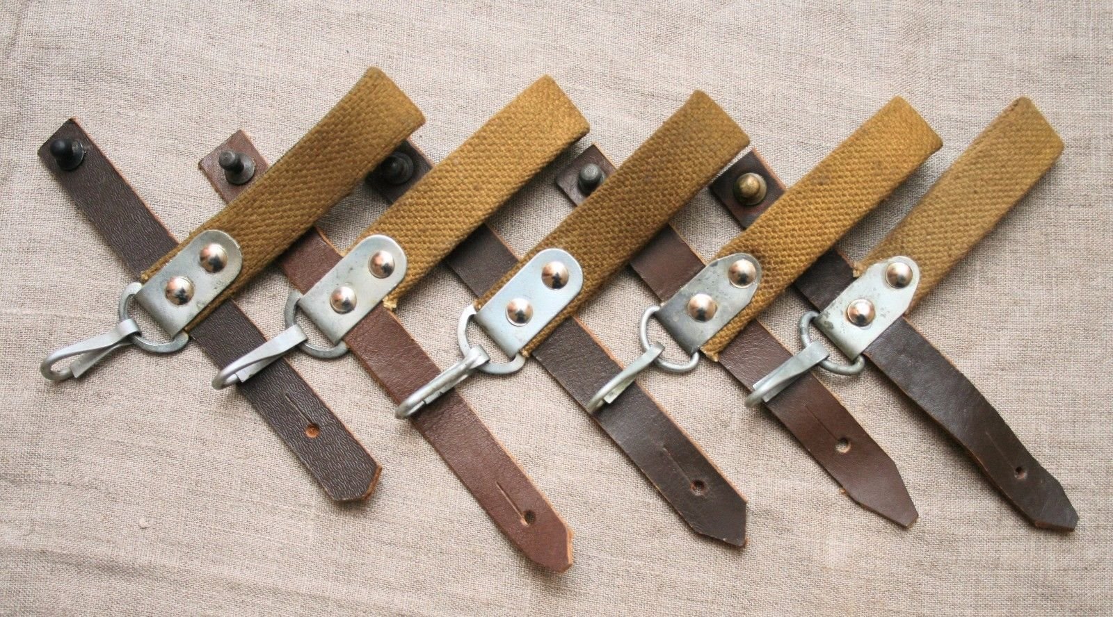 I recently acquired another early style Russian snap hook hanger. This is the variation with the metal bracket and single snap hook. The one I posted previously was made with synthetic (vinyl) leather. This one is real leather and probably the original version. They are pictured here together for comparison. The reddish one on the left is vinyl, the one on the right is leather. Mike