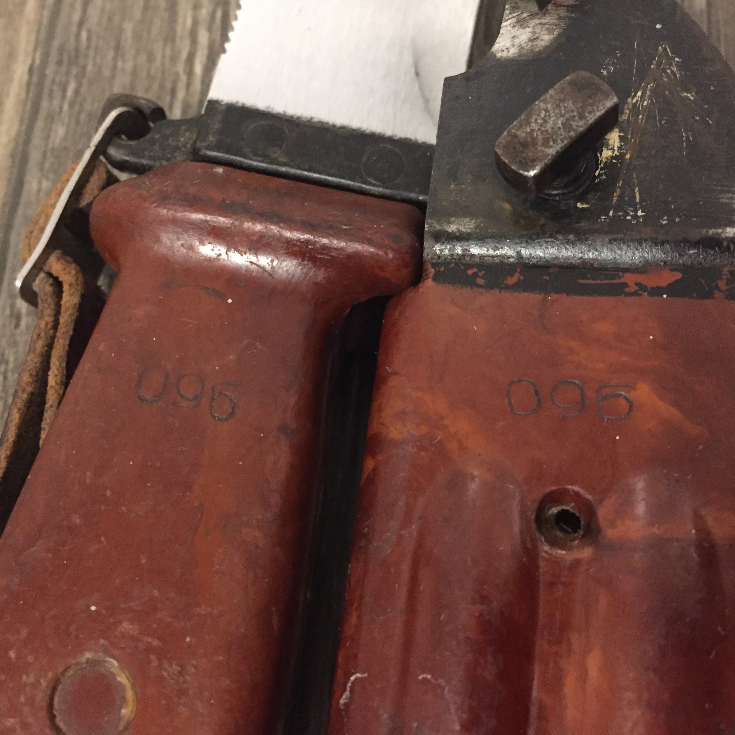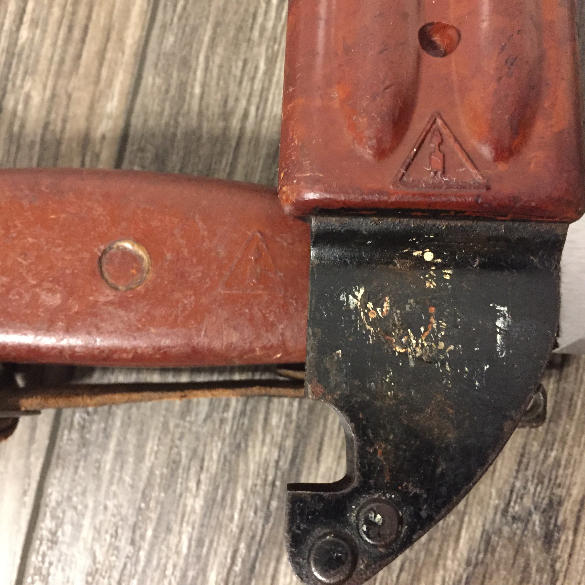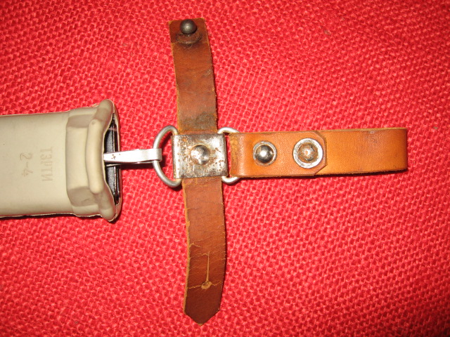 Perhaps this should have been the 1st item in this post. This is one of the 1st examples of a Russian AKM snap hook hanger. What is believed to be the original hanger was a sewn or riveted on fabric belt hanger that carried over from the Tokarev, Siminov, and AK47. This proved impractical as the belt had to be unfastened and the entire scabbard assembly removed to be able to use the wire cutter. Several different designs were tried to make the scabbard easier to remove from the belt using a snap hook. This one is the earliest one found in pictures or drawings. It used the flat bar attachment on the existing AKM scabbards. The snap hook assembly was permanently attached to the scabbard and used existing "D" ring belt loops the were part of the service belt. Later this design was obsoleted/recalled and was removed during inspections and rework. The hanger had to be cut off and the flat bar attachment modified to be able to attach a snap ring directly to the scabbard. These hangers are very rare as most were scrapped and destroyed after being cut off. M.