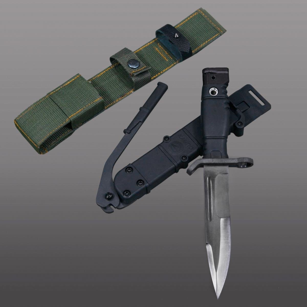 I really like this bayonet with its new features. Glass breaking triangle protuding beneath the pommel and the scabbard with build in wire cutter.