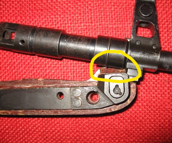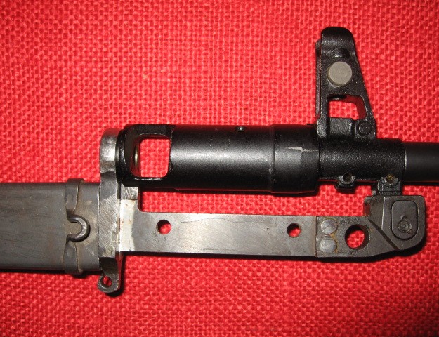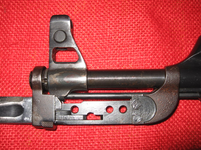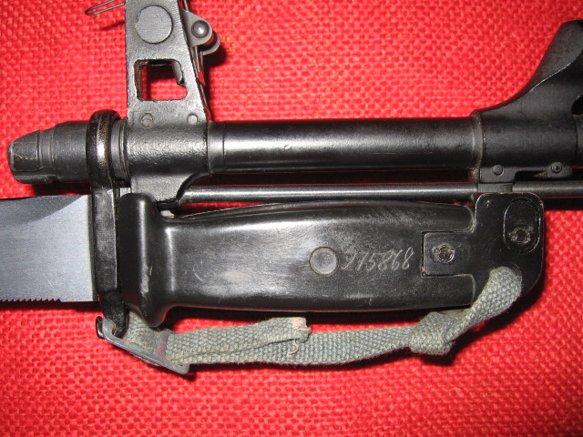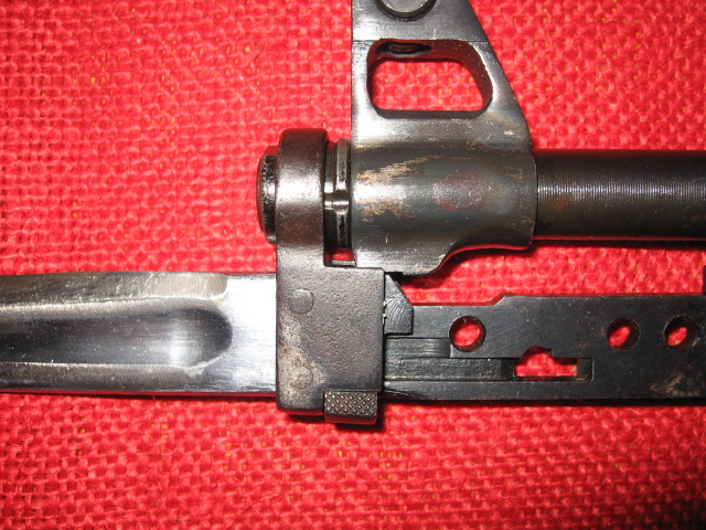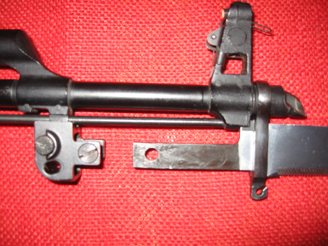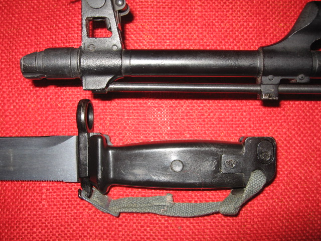 Maybe these pictures will help illustrate the means of attaching an AK47 bayonet to a rifle. The first picture shows the required "fangs" on the bottom of the FSB. The rifle pictured is a Chinese Type 56, (AK47) and the bayonet is a N. Korean AK47. I was using them to illustrate another post I am working on and they also represent the degree of interchangeability of all the ComBloc AK47 rifles and bayonets. Mike