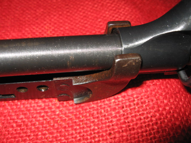 NOTE: Of special interest it the way the small flat area behind the bayonet muzzle ring fits into the front of the cleaning rod bracket under the front sight base on the rifle. This fit helps stabilize the bayonet and keep it from rotating around the axis of the barrel. If you examine that flat area, you will notice that it is an integral machined part of the cross guard. It covers the top and sides of the blade tang as it protrudes through the cross guard.