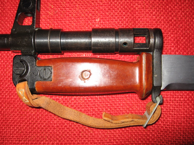 A couple more pictures of the AK47 bayonet design with the hairpin latch spring installed, (fun procedure!?). Note the small N. Korean star mark on the side of the cross guard between the rivets. This bayonet is in very used condition condition and has been excessively sharpened. It came with the correct red/orange grip panels, but no scabbard. It was picked up in Viet Nam in 1969 during a bomb damage assessment mission. Supposedly a NVA officers bayonet!? Mike