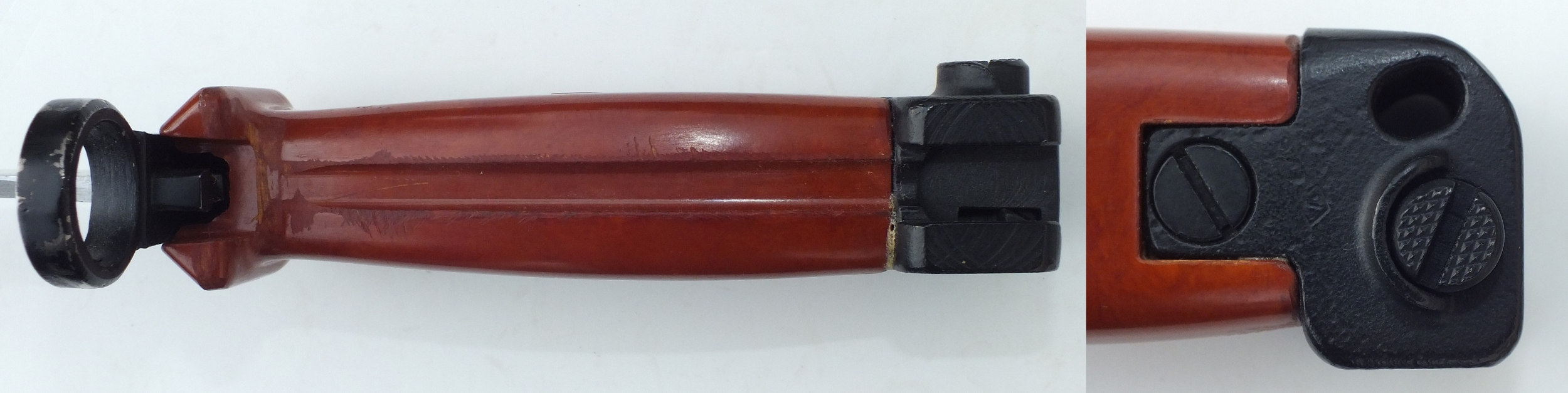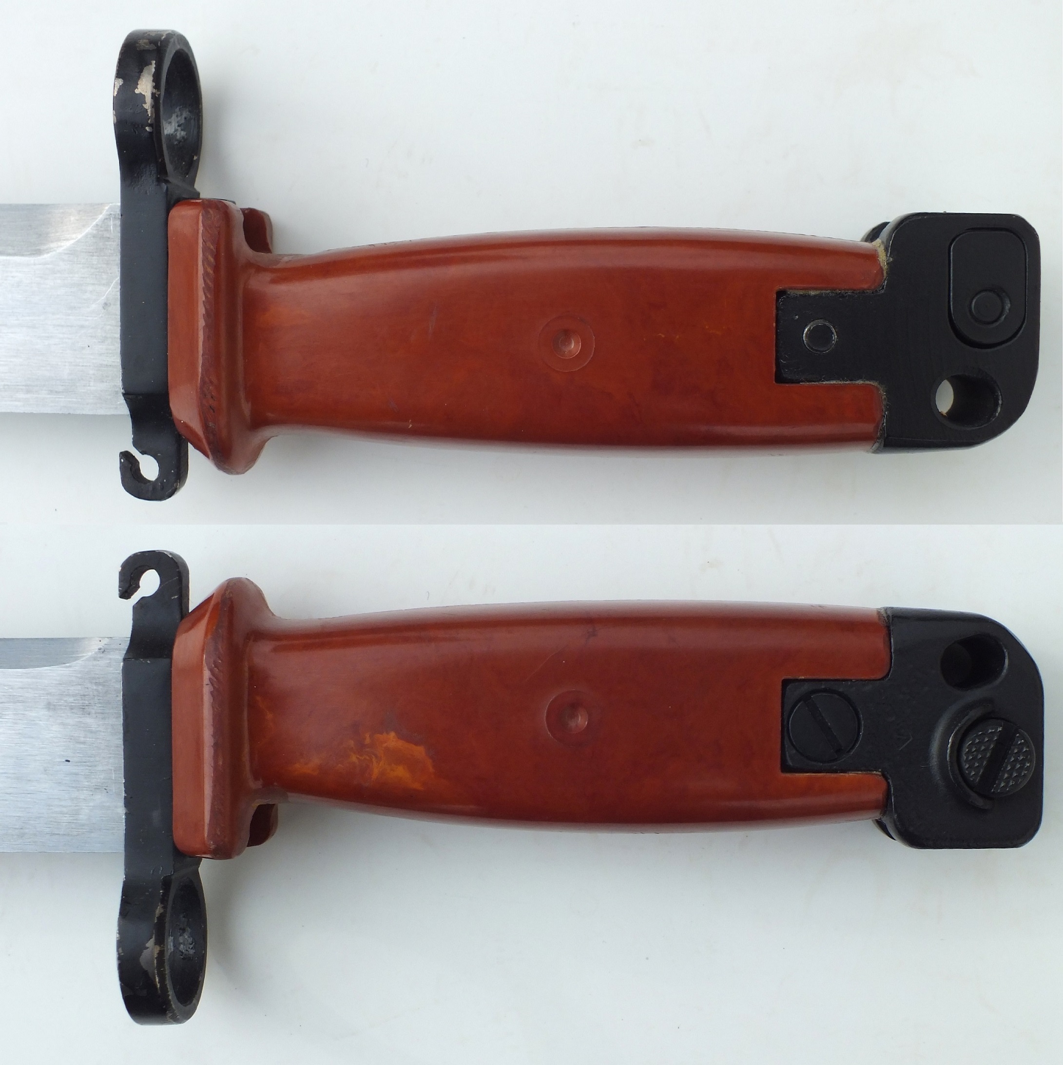 That's what I thought. Thanks for the semi-confirmation. I would think Poland and all the other ComBloc countries that manufacture the wire cutter bayonets would use procedures similar to the M9 for the blades. It appears Poland was simplifying the 6H4 to cut manufacturing expenses on these bayonets. I understand these prototypes were made up for possible contract sales? They were already less expensive than other typical Type IIs without the saw teeth. By using exiting tooling but eliminating the pivot hole, and the guard hook machining on the bayonet and a different finish.. I wonder why they didn't eliminate the strap hole on the pommel as well? Maybe cost more to eliminate than the savings? They must have considered making large quantities of these variations to justify the savings for all the changes.
