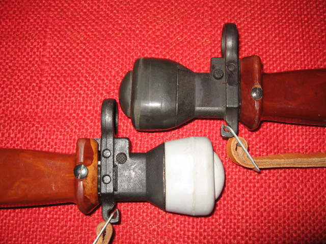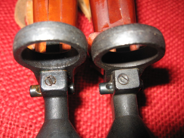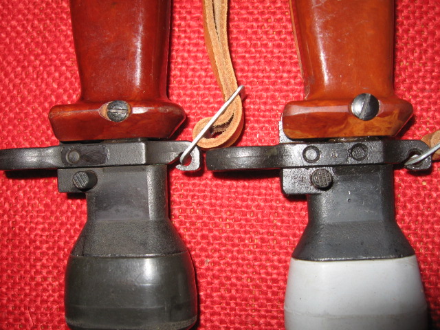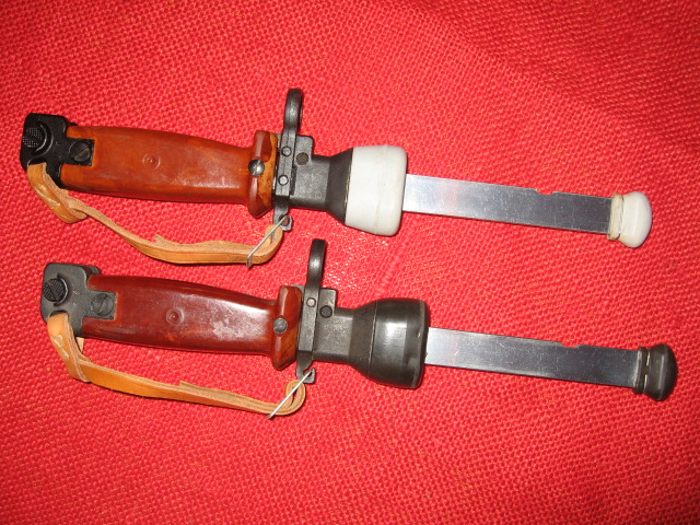 I currently only have two of these Polish trainers. My goal was to keep and display only two representative samples to display most of the main variations, as other than marking and colors, they are pretty much the same and some what expensive. There seems to be only one major change in the metal parts and that is the extra rivet hole in the cross guard, which was not used, disappeared sometime in 1987. In SIG_551_SWAT's 2nd picture above it seems this happened between Nr 3391 and Nr 4371. It is unknown if there is an actual cut off number or if this was a running change as old parts were used up. Another difference is the metal finish, blued or black painted. There are also differences in the head sizes of the small screws at the front of the grips to the cross guards. There are also different colors/shades in the grips from orange to dark brown just like the actual bayonets. Most obvious are the different shades of the rubber collars and tips from white to black. These rubber parts are easily replaced and switched around. Below are my 1986, (light colors, painted), and 1988, (dark colors, blued).