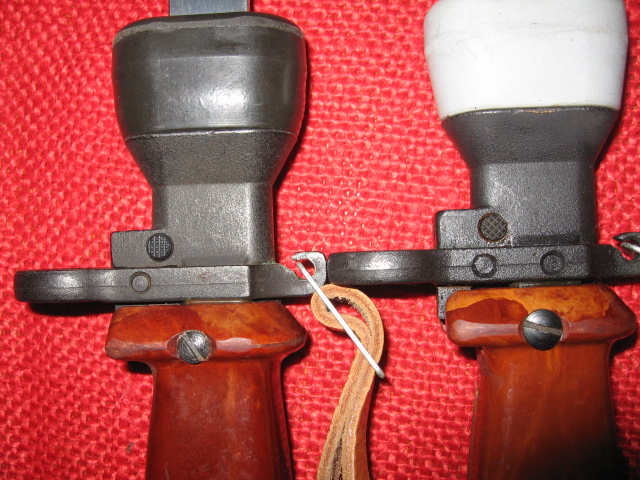 Here are a few more pictures of the WZ 85 bayonets. Note the molded indents on the grip sides and that the pommels are secured to the grips by machine screws with heads on both sides as they do not go completely through the pommel. Also for general information, none of the parts for these trainers interchange with standard 6H4 Type II bayonets. They may be manufactured on the same machinery and the same basic technology but completely different in final machining and assembly. Ooooops, the bayonet mounting catch assembly may interchange!?