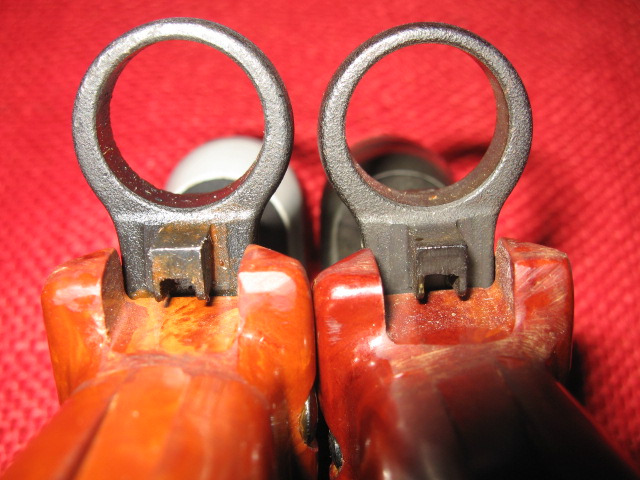 Comparison photo between 1986 and 1987 versions showing the extra rivet hole in the cross guard Nr 01463