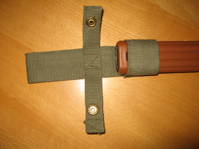 I recently obtained this hanger because it was different. At first I thought it was typical web hanger for a scabbard with a hook or stud. It seemed similar to WWII British web hangers, but it was missing a hole or slot to secure the scabbard.