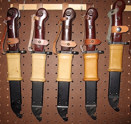 Here are the Hungarian AKM 6X3 Type I bayonets I display in my collection. L. - R., Early version followed by three with variations in color, teeth and markings. The last one, unmarked, is from an export contract. I will be glad to post close-up or comparison pictures on request. Mike