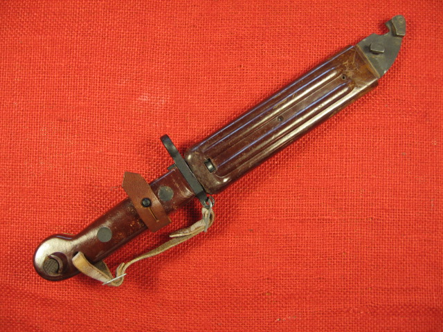 I bought this bayonet and scabbard several years ago from a Gulf War veteran who brought it back the way he found it as a souvenir. I included it today as I was doing research on Hungarian bayonets. I'm not sure how to classify it except as an Iraqi mix-master. The bayonet is a typical Hungarian AKM 6X3 Type I unmarked export bayonet. The scabbard however is an unmarked Iraqi Tabuk AKM Type II variation. The wrist strap appears to be Hungarian. The one piece hook hanger is typical and of unknown origin. Unusual and nice looking combination of bayonet and scabbard. Mike