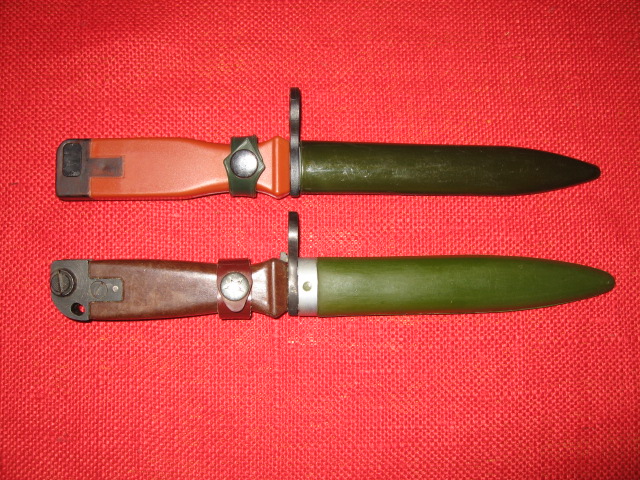 Here's one more 'training' bayonet that I'll post as a replica/toy as I don't believe is actual military. It's a copy of the Chinese Type 81 bayonet and scabbard. The blade is flexible rubber the rest is molded plastic. It does however have a functional plastic catch assembly. The molded plastic hilt is all messed up with the catch on the wrong side and the top and bottom reversed as well. Here it's shown with an original Chinese military issue Type 81. Mike