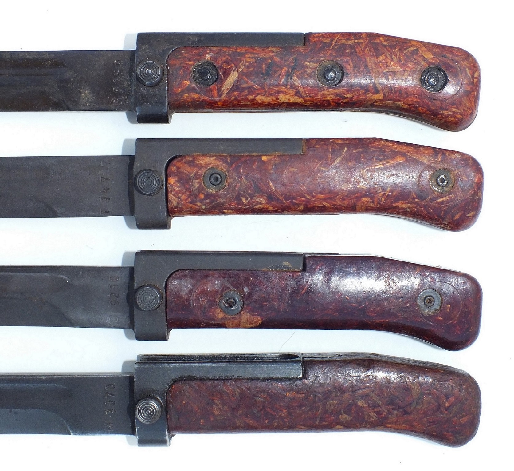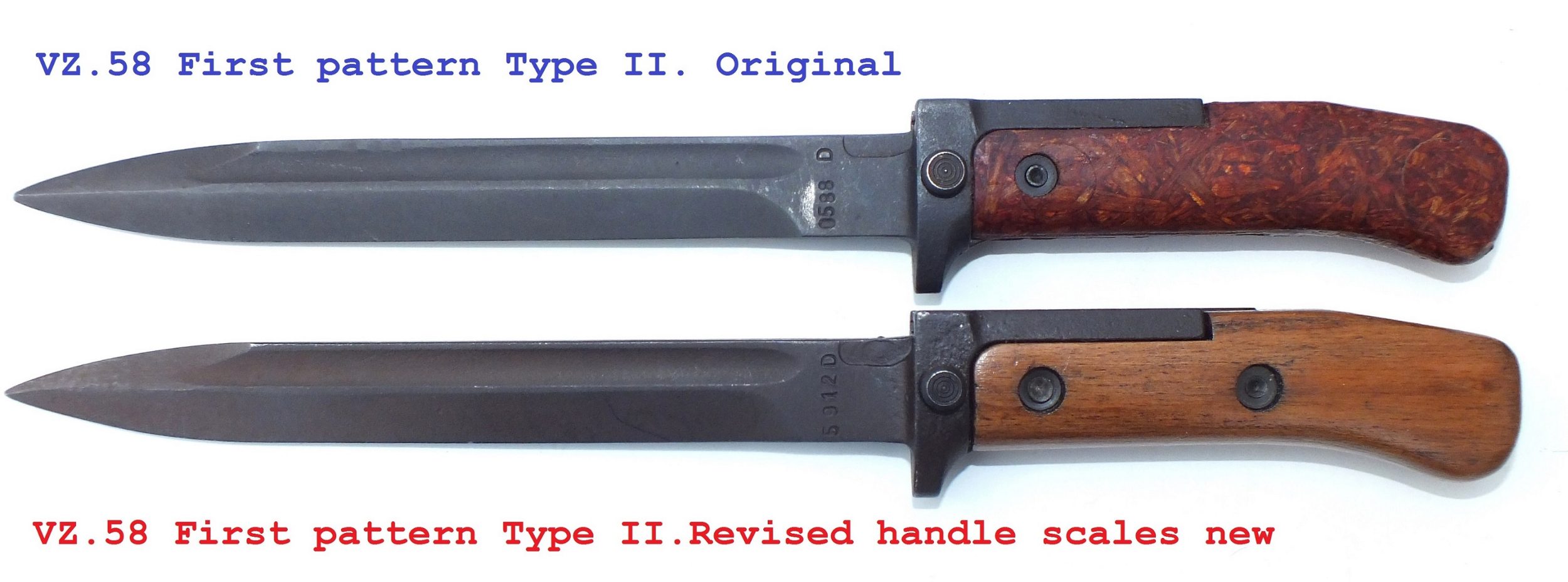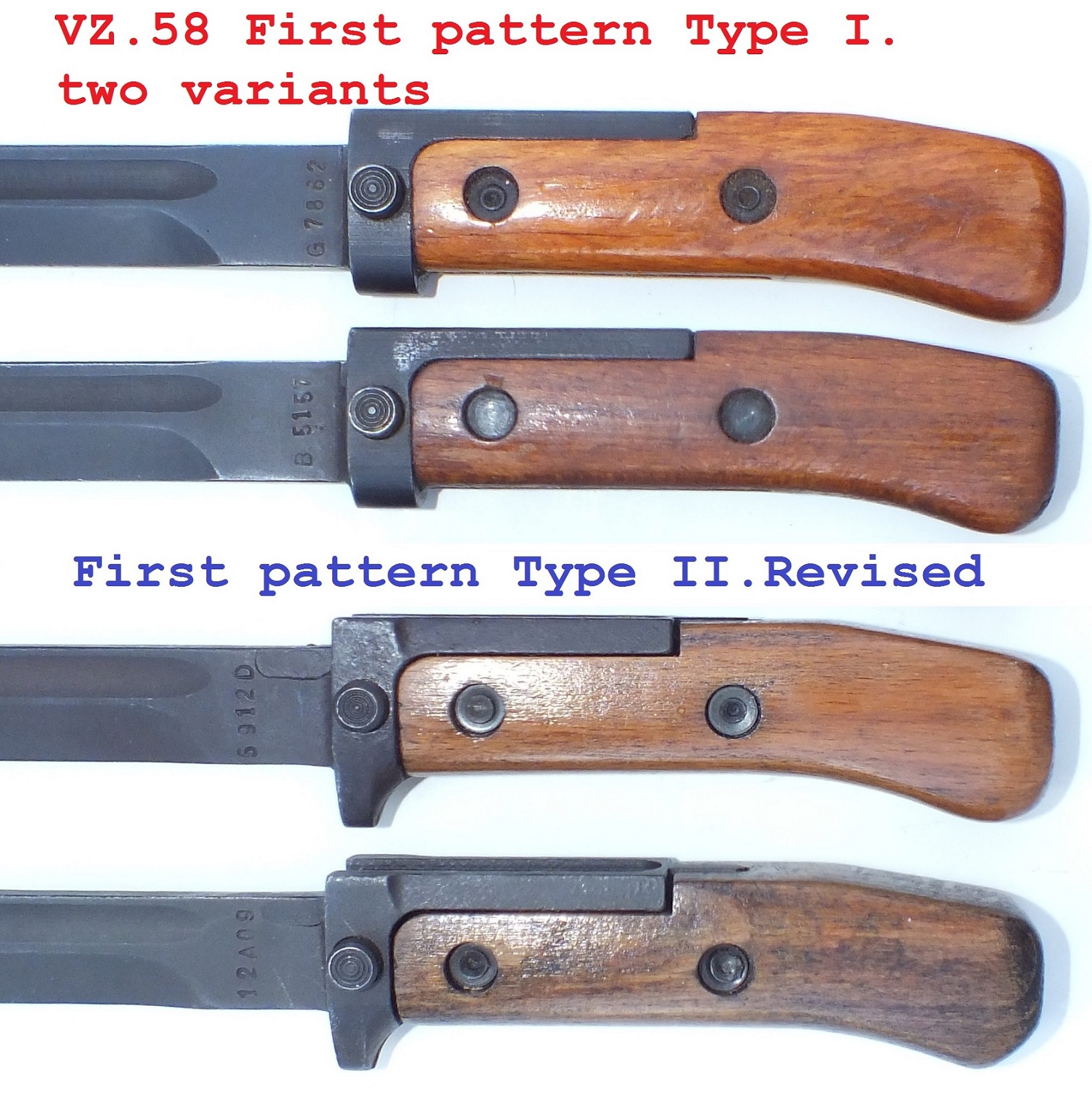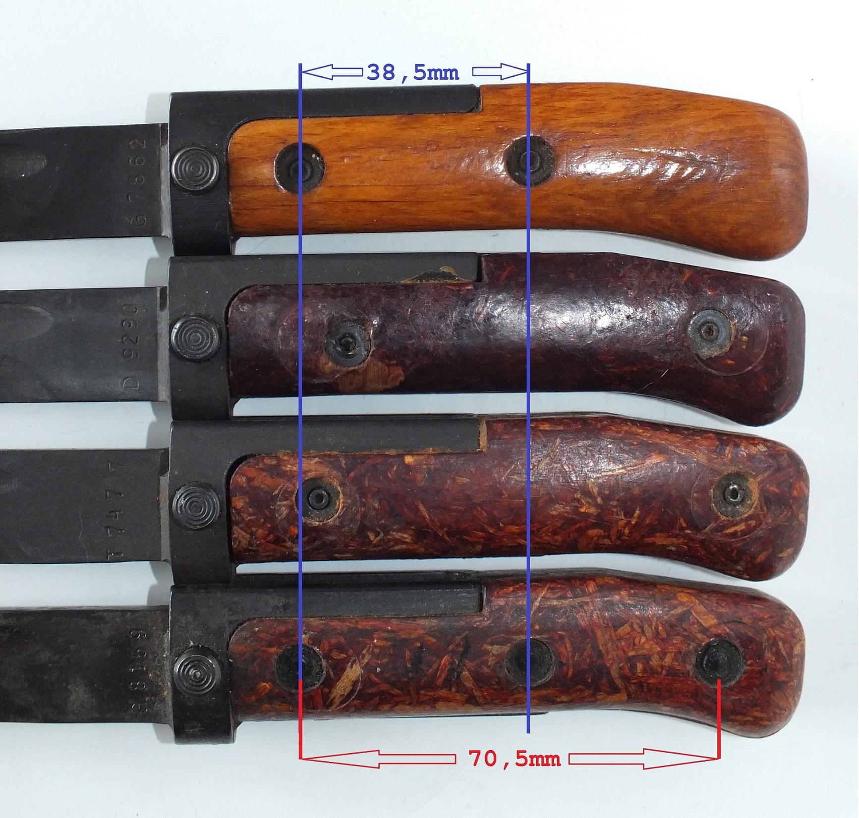 Gerhard, the very first bayonet at top of your post appears to be a very nice original VZ58 bayonet with a wood grip. The rest of the wood handled ones pictured may well be reproductions in my opinion. I say this as to my knowledge from references and sources in Czechoslovakia, The wood grips were only used on the early Type I bayonets and were soon discontinued. This was due to issues in manufacturing and installing the grips. Difficulty with fit and finish as well fragile and prone to splitting/ breaking during installation. They proved to have the same problems during issue and usage. The wood did not do well during weather changes, worked loose and were easily damaged and made unusable. They were discontinued in production and recalled and replaced during any inspection or rework. This information comes from an armorers manual. It is also safe to assume the a wood grip would rarely be used as a replacement during rework except perhaps on very early items before replacement grip panels became available. Even then the rivets would have been similar to the original ones. If all this information is correct the wood grips were never arsenal installed on the revised Type II bayonets and would not have been used on them during any subsequent rework.
