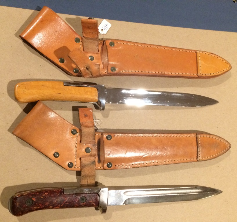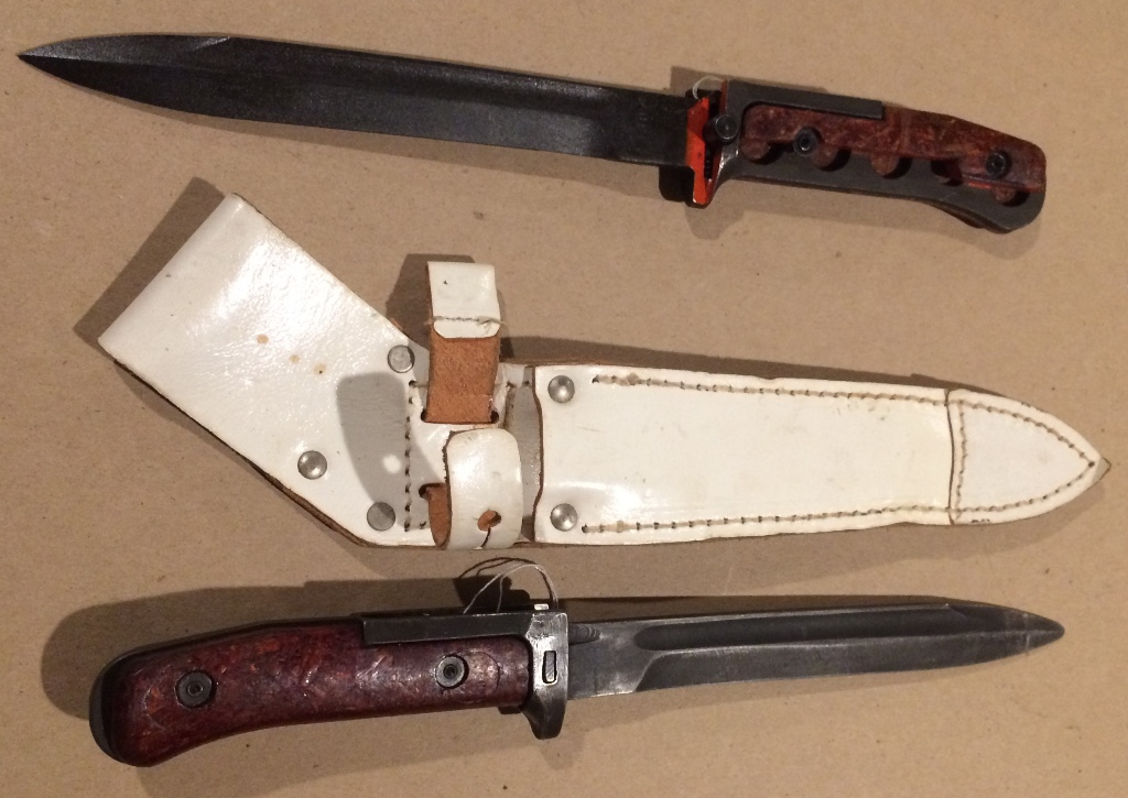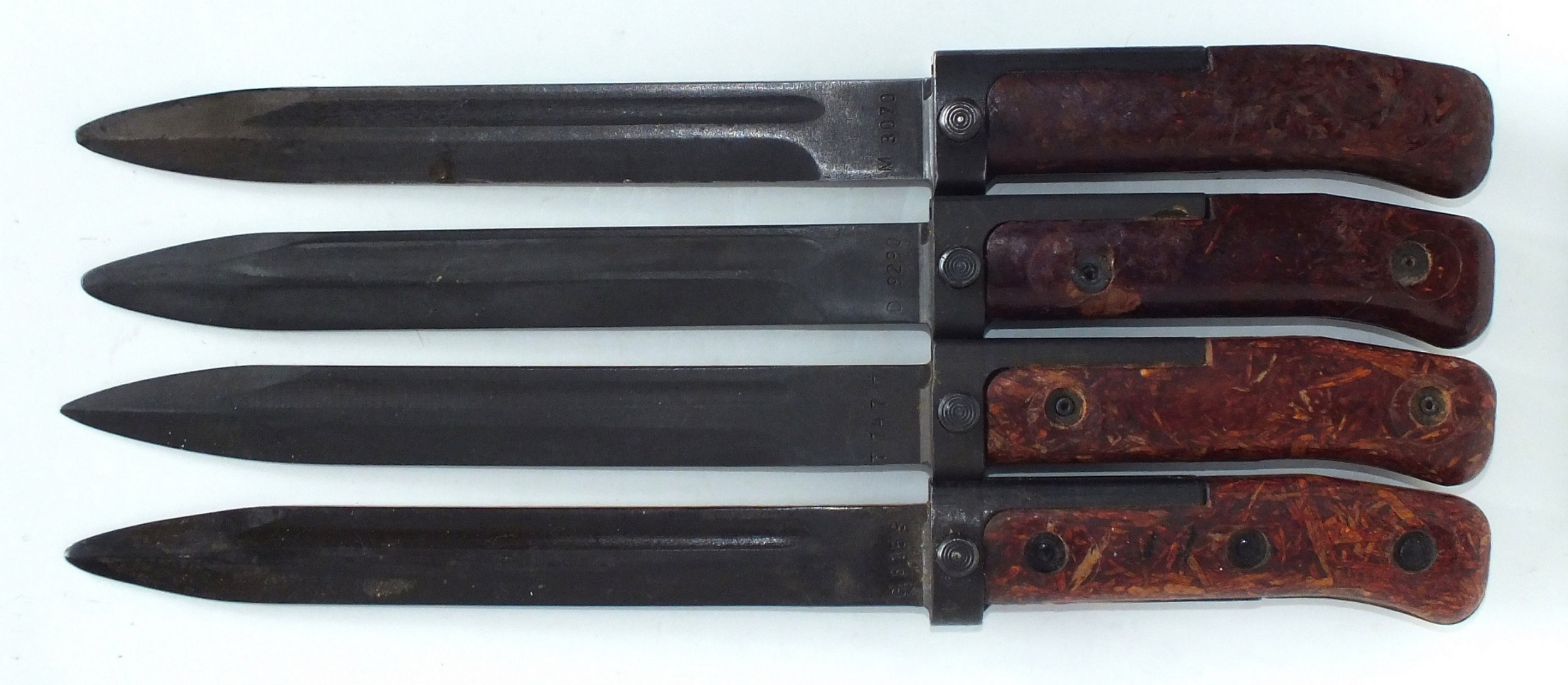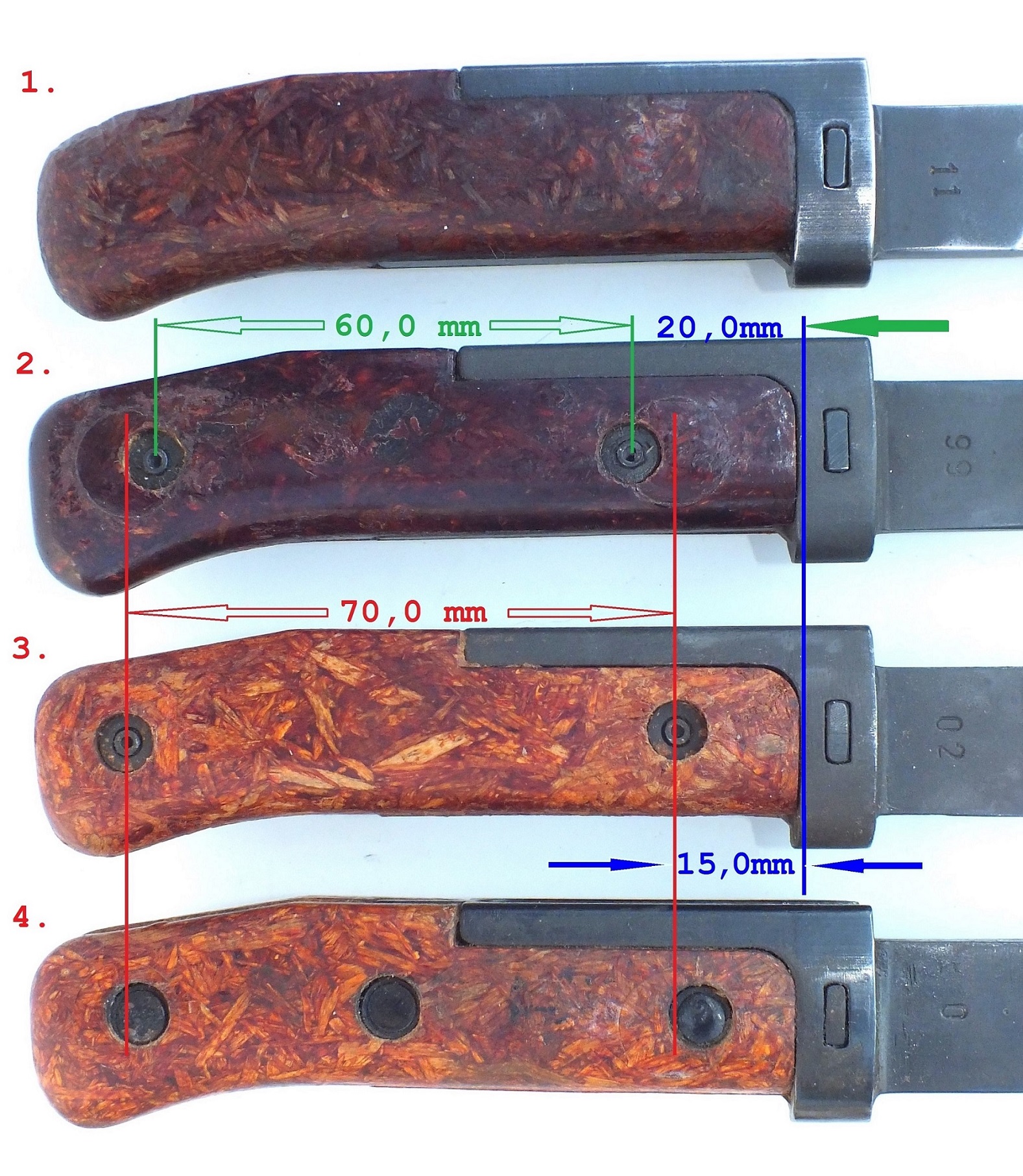 Gerhard, the very first bayonet at top of your post appears to be a very nice original VZ58 bayonet with a wood grip. The rest of the wood handled ones pictured may well be reproductions in my opinion. I say this as to my knowledge from references and sources in Czechoslovakia, The wood grips were only used on the early Type I bayonets and were soon discontinued. This was due to issues in manufacturing and installing the grips. Difficulty with fit and finish as well fragile and prone to splitting/ breaking during installation. They proved to have the same problems during issue and usage. The wood did not do well during weather changes, worked loose and were easily damaged and made unusable. They were discontinued in production and recalled and replaced during any inspection or rework. This information comes from an armorers manual. It is also safe to assume the a wood grip would rarely be used as a replacement during rework except perhaps on very early items before replacement grip panels became available. Even then the rivets would have been similar to the original ones. If all this information is correct the wood grips were never arsenal installed on the revised Type II bayonets and would not have been used on them during any subsequent rework.