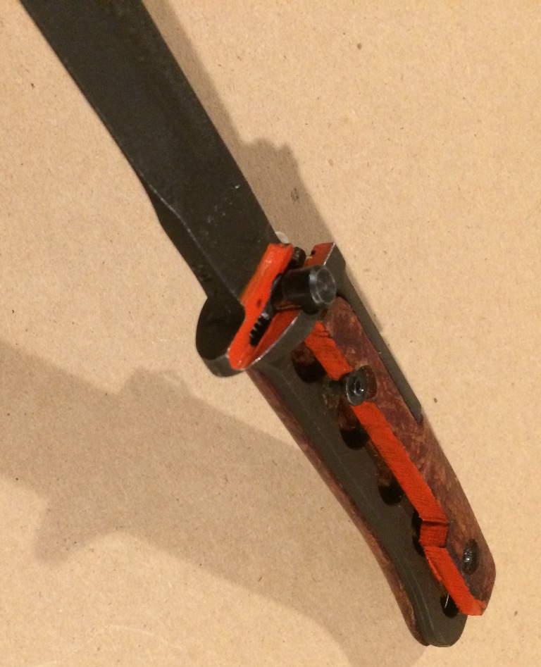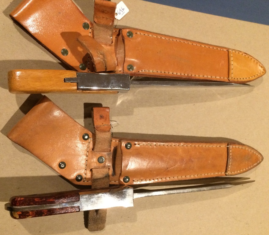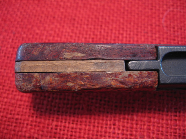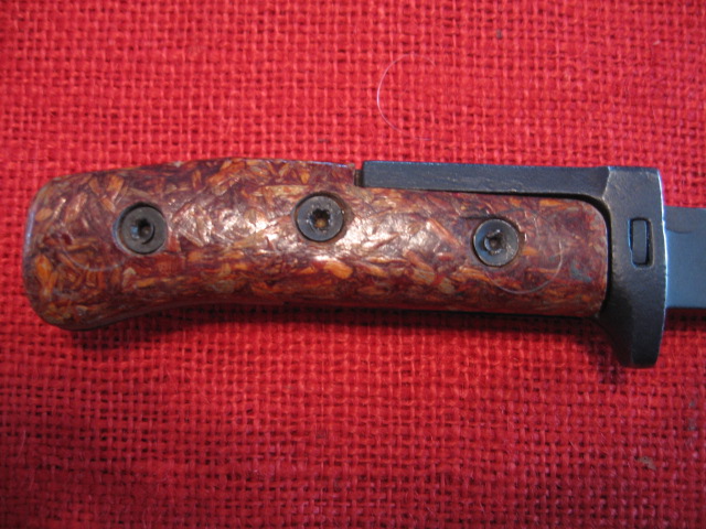 Here is another non-standard, reworked, repaired variation. Type III flat sided grip panels have been grafted onto a Type II short tang bayonet using a wood filler piece and three rivets in non-standard locations. The rivets appear to be similar to the official ones, but have been set with the wrong tools. Notice the crude appearance of the rivets. Mike