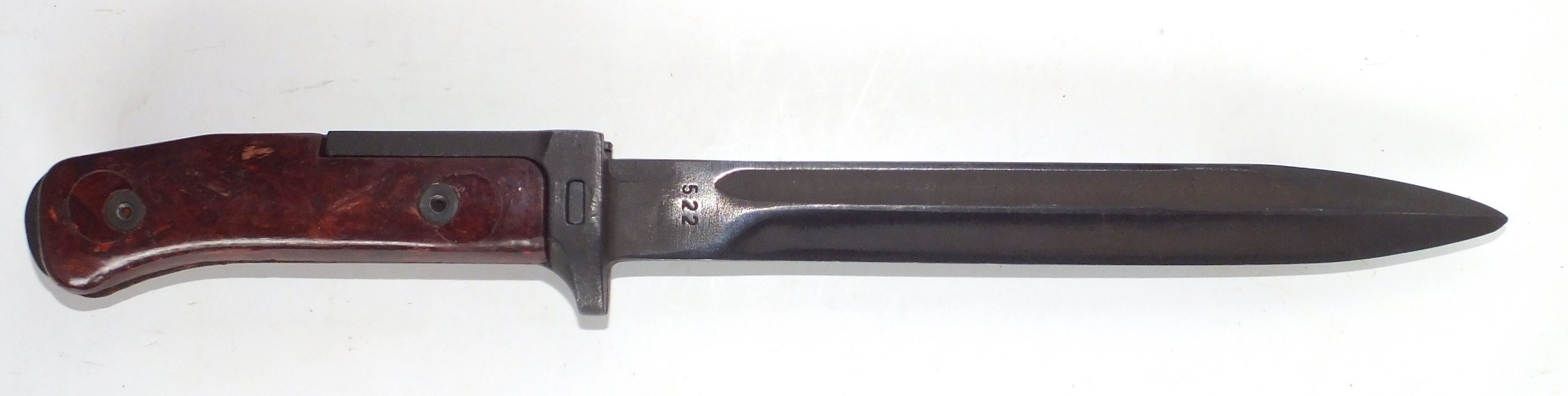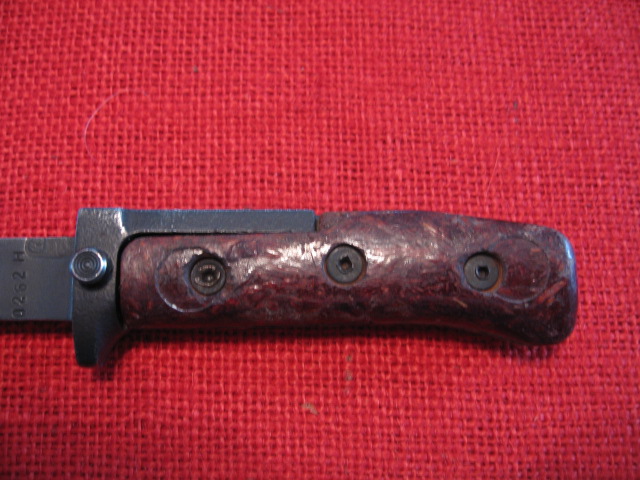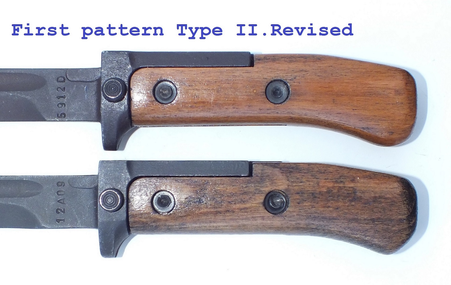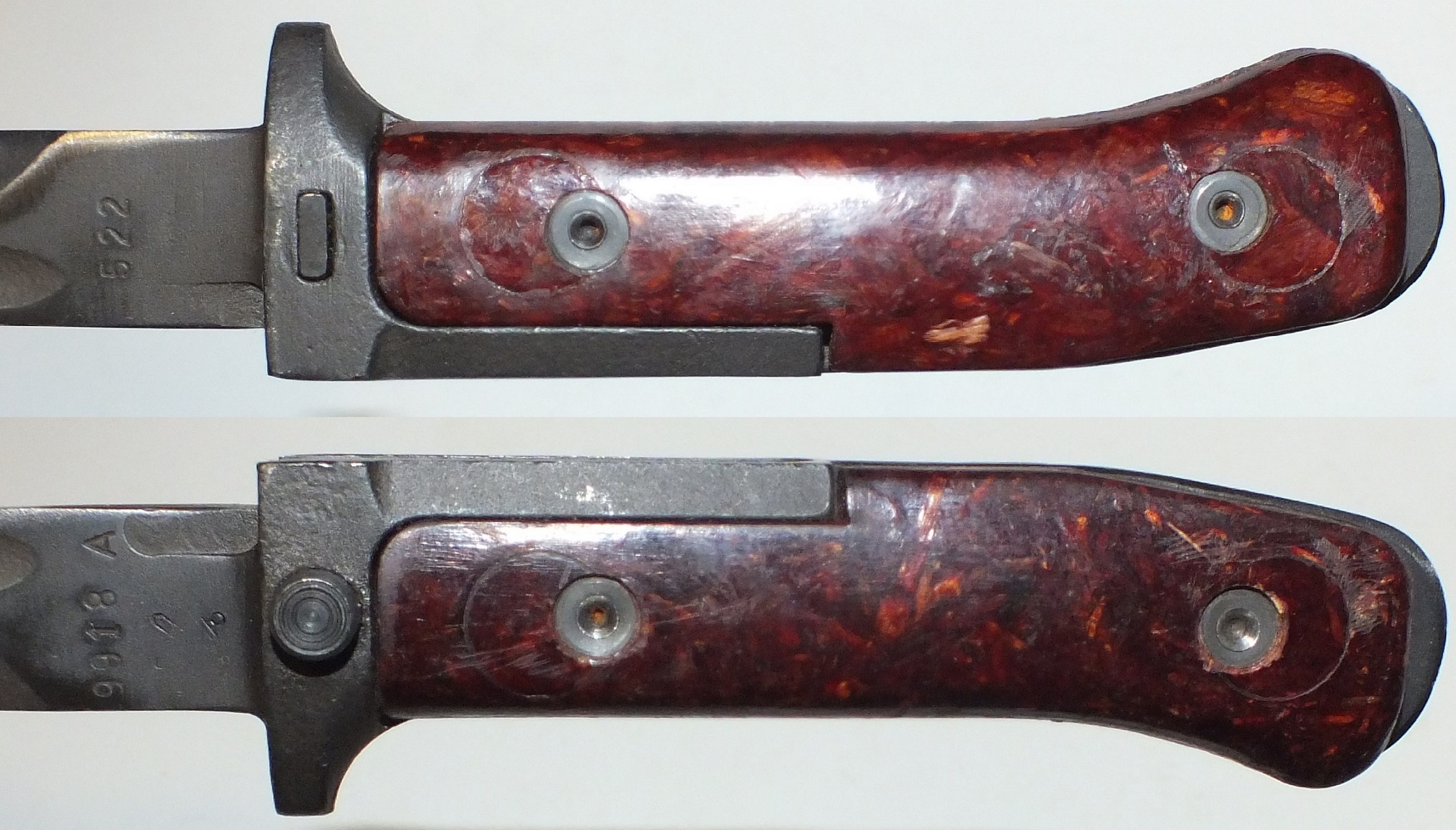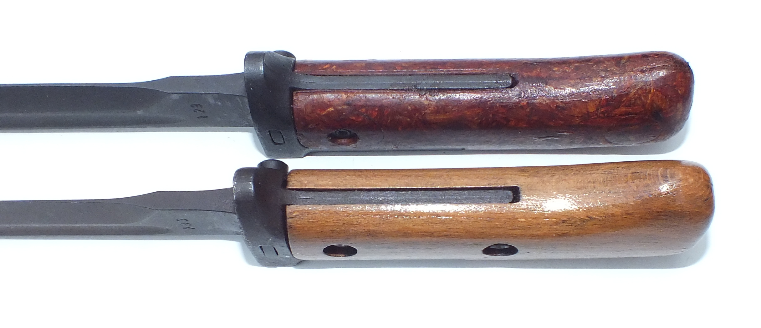 The wood handles have recently been reproduced and available on eBay either separately or on reconditioned Type I and II bayonets. This has been done for the collectors market and are in my opinion reproductions. The wood grips are even offered in your choice of wood and finish on request. This appears to be the case with these bayonets as the rivets do not appear to be like the original ones installed by the arsenal. The original rivets appear consistent through out the production of the VZ58 bayonets. Note that the Type II bayonet with the resin grips above has only one rivet and is a result of a field or depot repair or rework. Even then the rivet is correctly install to specifications and appears like the factory ones.