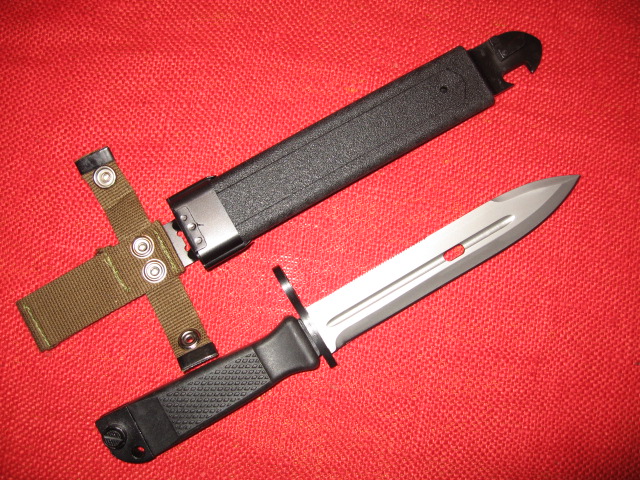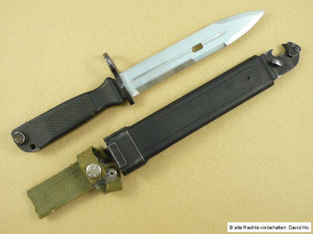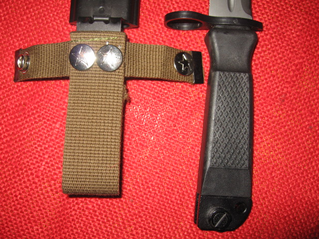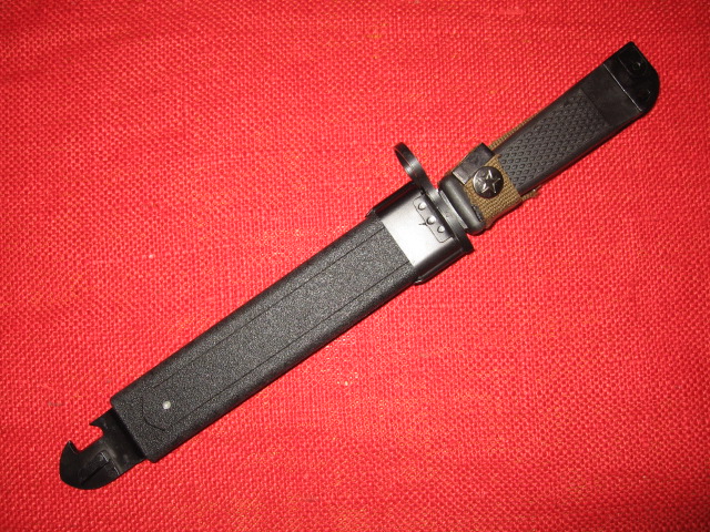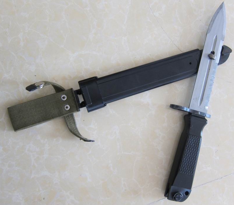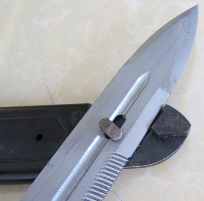 This is what is advertised as a Chinese Type 85 bayonet and scabbard. There is no verification that this bayonet was ever made for or issued to the Chinese military, (PLA). It appears to be an up-dated Chinese Type 81 bayonet that has been redesigned as a wire cutter and mounts on the Type 81 weapons. No documentation of the bayonet has been found but similar blades can be found in military pictures. The bayonet I received came in a fitted "presentation" type box and from all appearances seems to be non-military bayonet made for the collectors trade. The construction feels flimsy, especially the release catch which is almost toy like. Weak spring, small thin catch and machine screw that are not staked in place. No numbers or any type of marking. I purchased this item as a "representative" example and to find out what the small "lever" was on the back side of the scabbard cutter plate. It is a can opener! It is non-moving and is permanently held in place by rivets. Mike