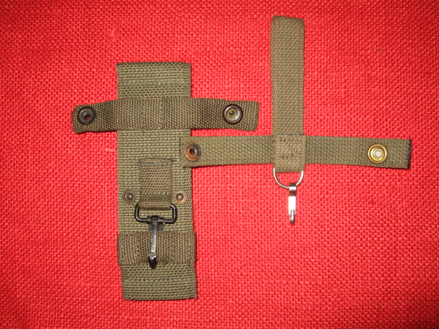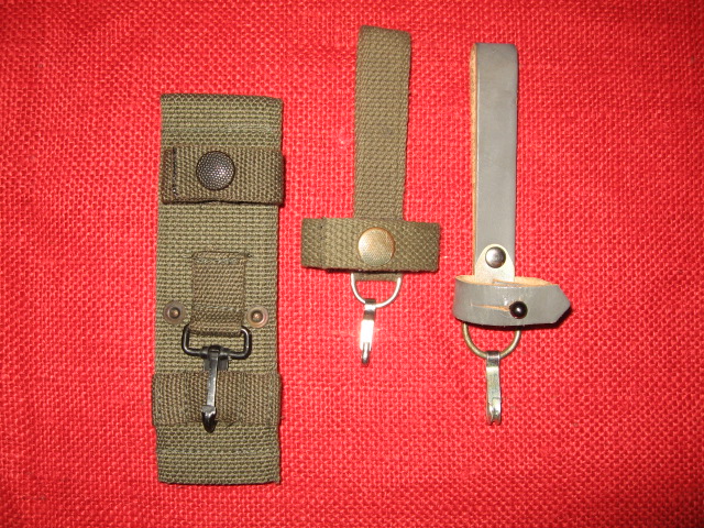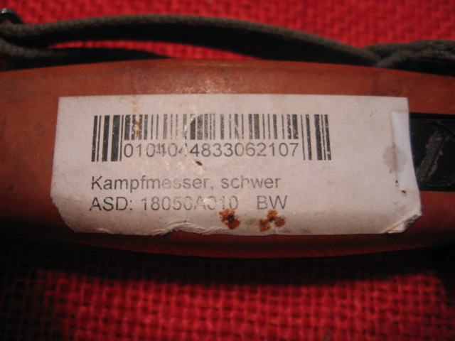 Pictured below are: 1. Bayonets with the stamped numbers. 2. The fabric hanger compared with the G36 hanger and a DDR hanger. Note the pebbled snap and that the strap crosses R-L (the DDR ones cross L-R). 3. An I.D. label stuck to the grip and compared to a DDR label. 4. A picture of FRG Bundeswehr troops with both orange and black grip DDR bayonets taped to their LBG. 6. The one I display in my collection. Mike