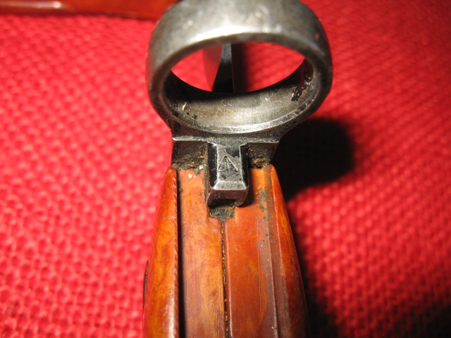 I have two Izzy examples, but both are the result of refurbishment. This is evident by the sloppy, glued screw plugs on the grips of each (and the first one having a etched serial number on the left side of the grip, just forward of the front plug). This bayonet had a original scabbard number shaved off, but interestingly it is a "mold #6". The other bayonet has a etched serial number on the crossguard which matches the unaltered number on the scabbard. However, since the scabbard is "mold #285", this would be a much later refurbishment, with the bayonet matched to either an unaltered scabbard number, or new scabbard numbered to match the bayonet.