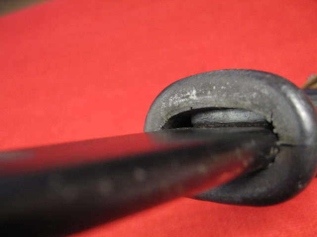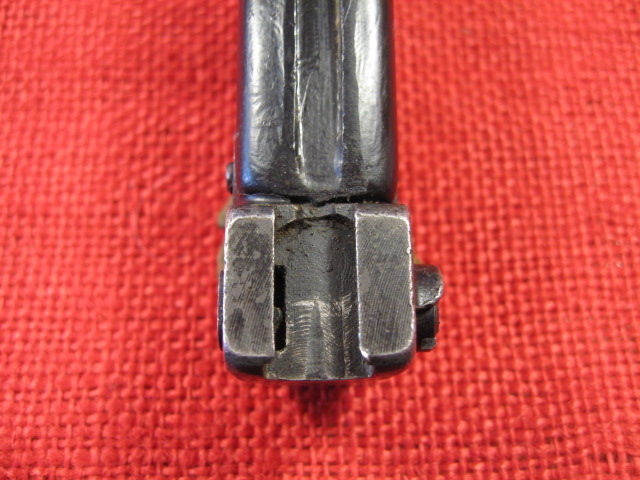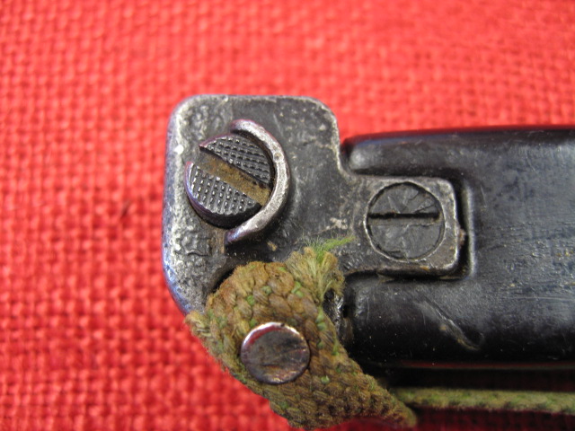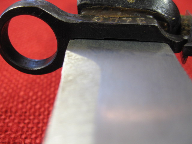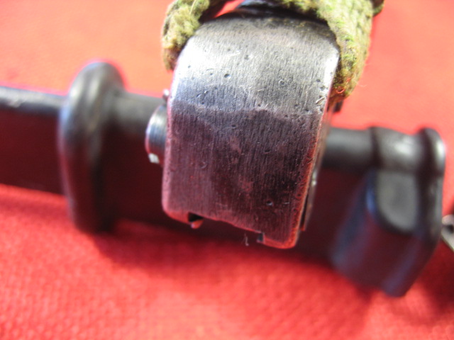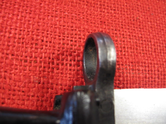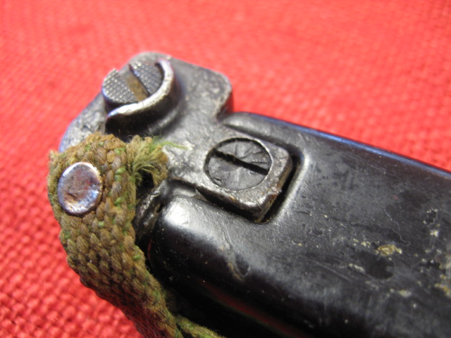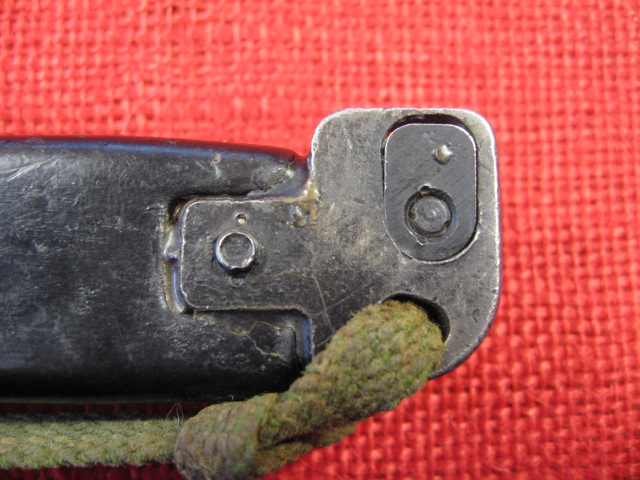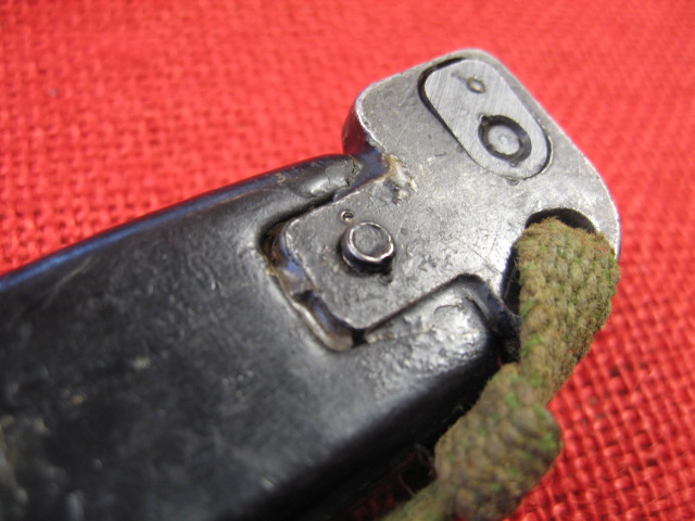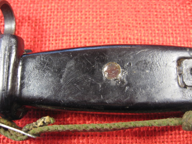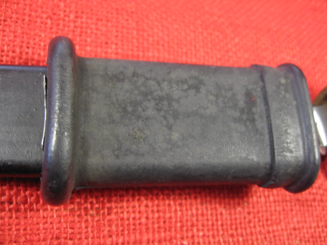 The scabbard also had another noticeable defect. The insulator stop that is spot welded to the front side of the body is miss-placed. This bayonet and scabbard came to me with out the rubber insulator and hilt strap. I installed a spare Egyptian black rubber insulator and a too short spare hilt strap that I had on hand. When I installed the insulator it seamed too long by about 3/8th inch. I measured the insulator and it was OK. Measuring the scabbard confirmed the insulator stop was welded in place 3/8" too high. When the insulator is against the stop the top is too high. Seating the bayonet completely in the scabbard forces the insulator over the stop.