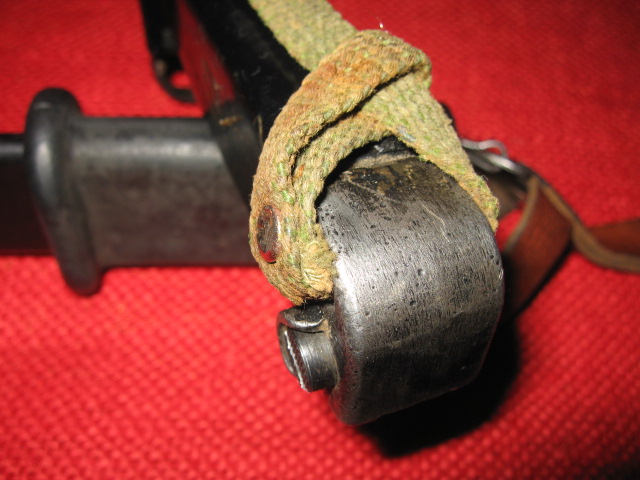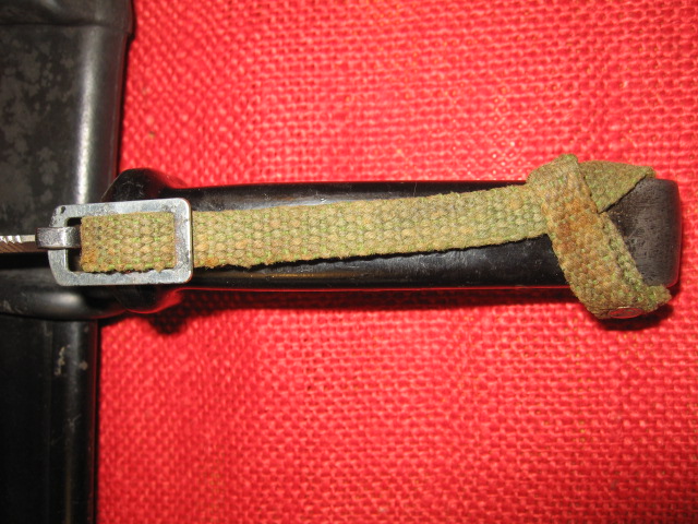One last thing. The bayonet came without a hilt strap. I had one spare Egyptian I had replaced because it was made too short. It hade the glue or sealant on the loose end, but about 1-2 inches shorter than most and barely reached the crossguard hook. Also the buckle was weakly plated and had some corrosion. I thought it was only fitting to display on this bayonet.