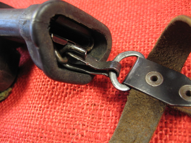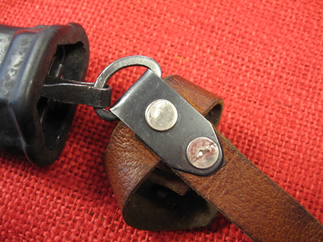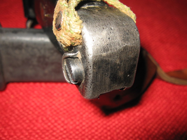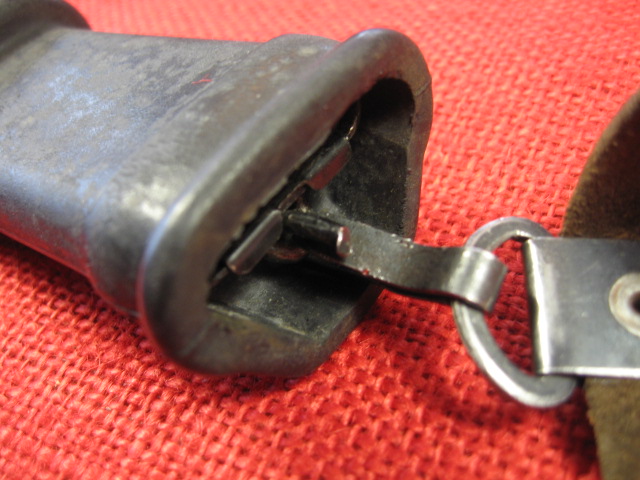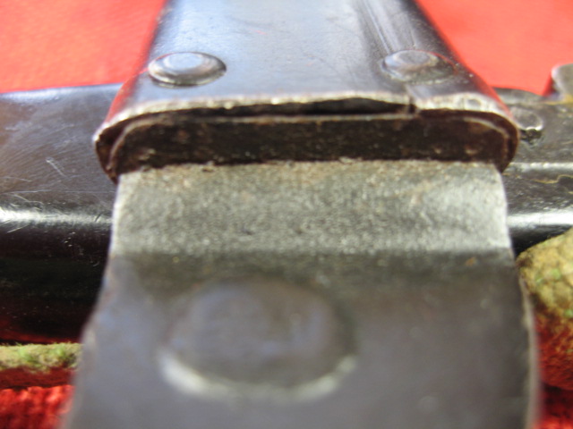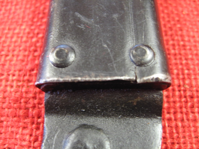 This is the hanger that came with this bayonet and scabbard. When I received it the snap hook was reversed with it being attached to the scabbard and hooking to the hanger. I corrected this, but noticed the black painted snap hook and loop were both crudely made to start with. The leather is typical for an Egyptian hanger and to me appears to be made of pig skin. When the hanger was formed the belt loop part was left too short in the riveted sheet meta bracket and only secured with one of the two rivets. Note the appearance of the rivets.