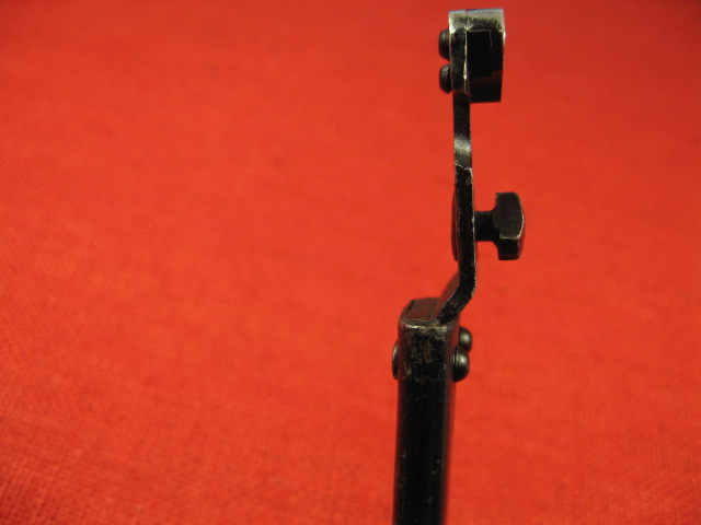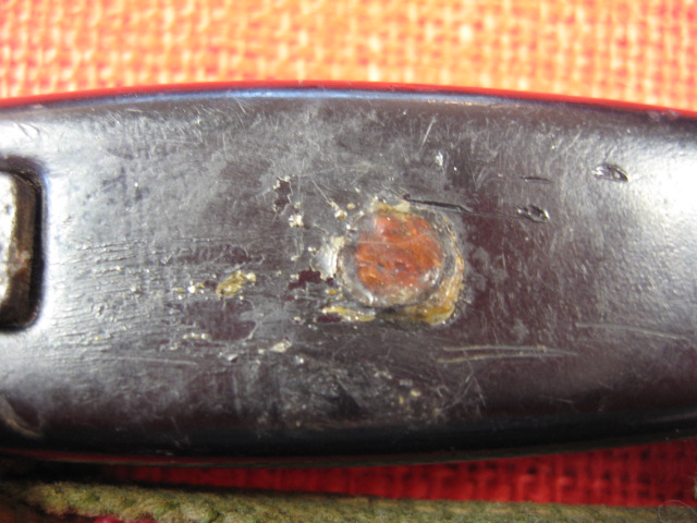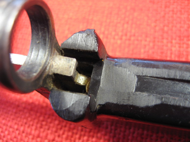 More pommel pictures. Notice the too long pommel attaching screw and the too wide slot on the release button. Also the misfit and miss-aligned lock plate. However the locking assembly does function.