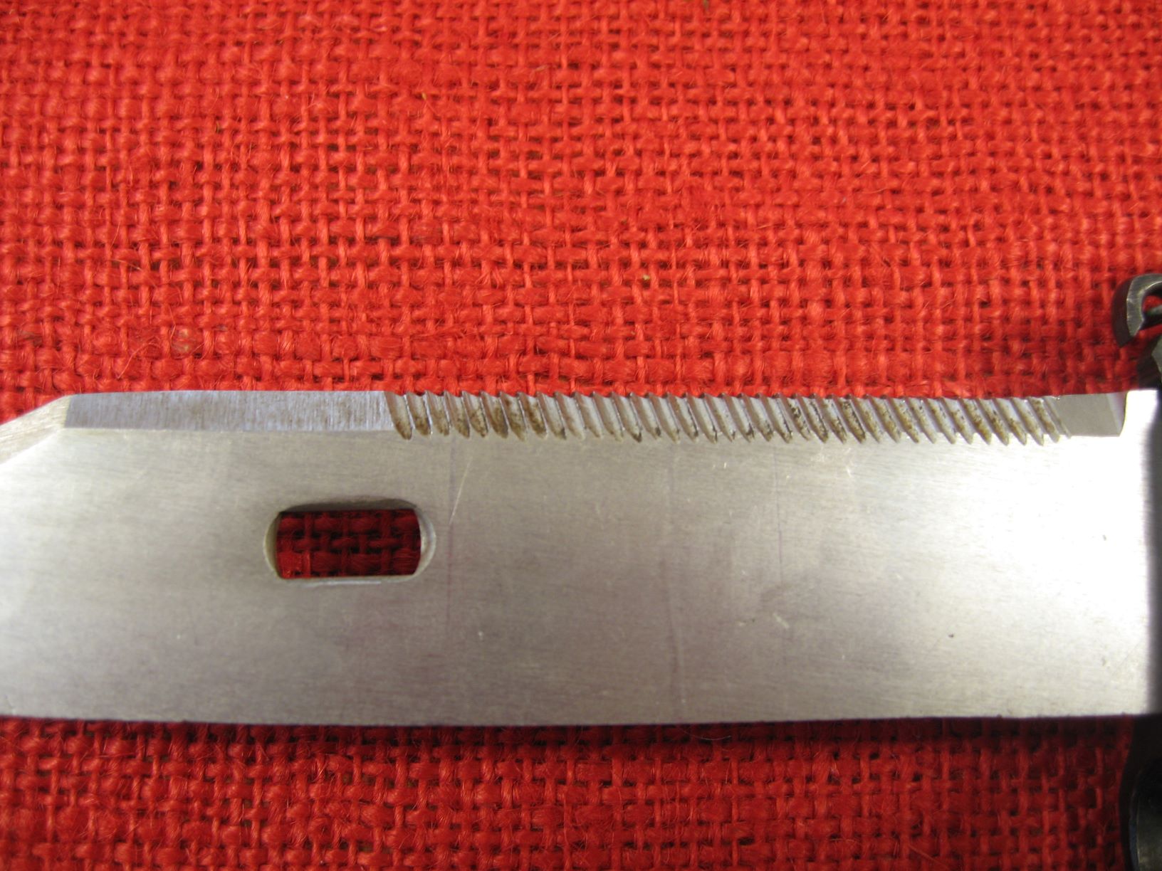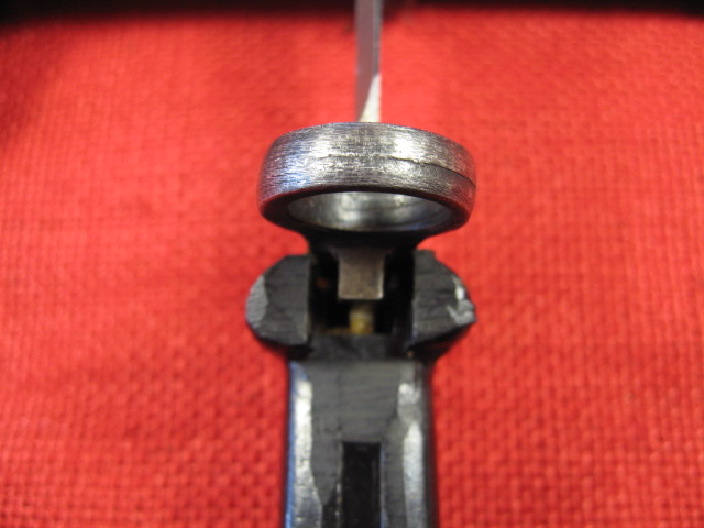 A couple more pictures of the blade saw teeth. Also pictures showing how the bayonet is out of alignment from the pommel to the point leaving the point off to the right of the rifle bore. Also a side note, the muzzle ring hole has only a slight bevel or chamfering but it's on the front. The chamfering should be on the rear making the bayonet easier to mount on the muzzle of the rifle.