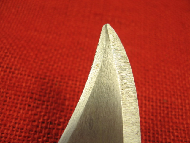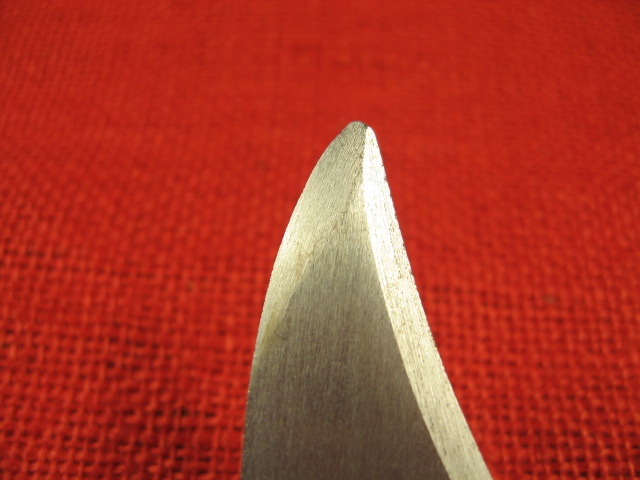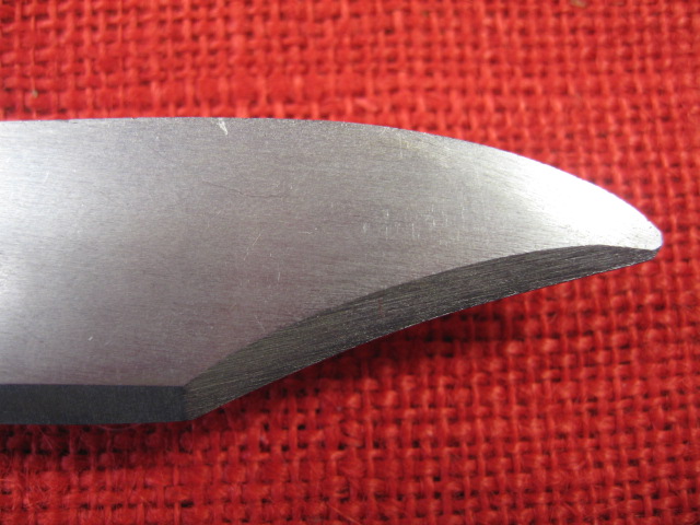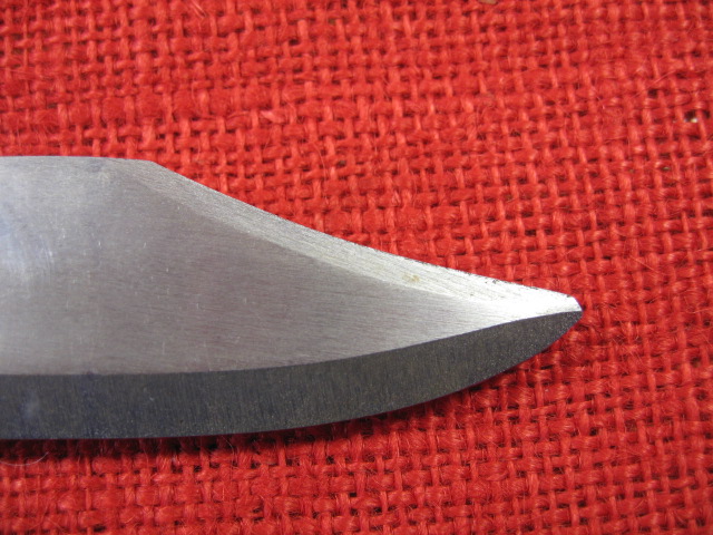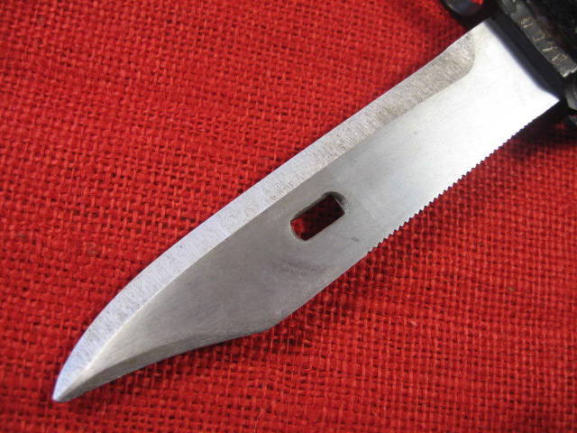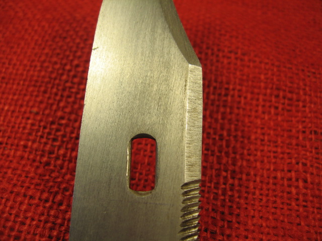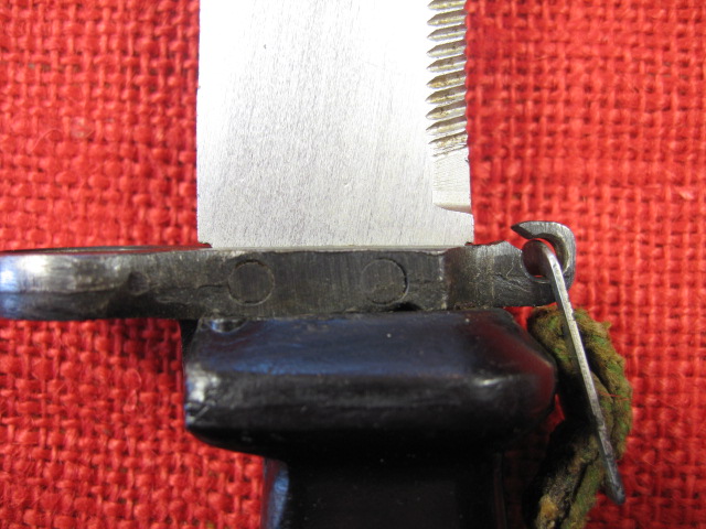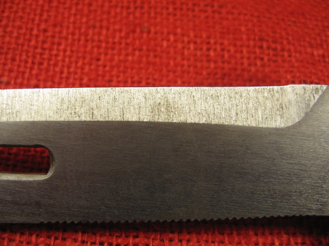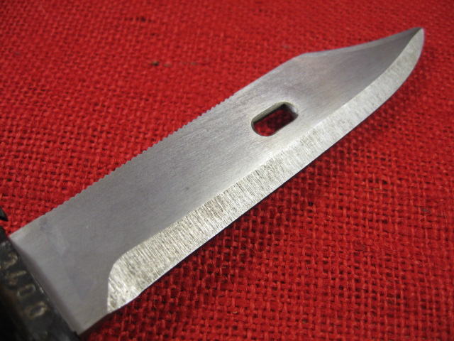 Next comes the blade. Over all, it is more of a clip point profile then the usual bowie style blade found on most AKM 6X3 & 6X4 bayonets. The blade flats have a dull brushed finish. The main edge is roughly and irregularly vertically ground but is sharp. The false edge is circularly ground but is dull at the edge. The wire cutting edge is also coarsely ventricularly ground and is also dull at the edge. The saw teeth cuts are irregularly cut, (no two cuts the same?), and are dull at the top. The blade point is non-existent. and in different places on either side. It ends up being rounded and dull. Still it is functional as a knife, spear and wire cutter,