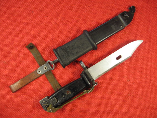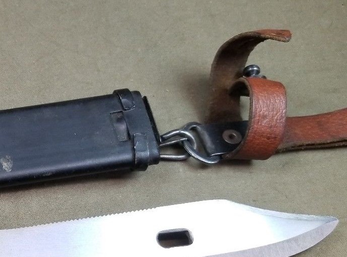 There's more, the Type I scabbard is a good match for the bayonet. As usual for Egypt, the scabbard body is made from a flattened welded seam tube. This seam leaves a noticeable ridged affect. The wire cutter plate is a stamped steel plate secured on the end of the body with a filler piece by two rivets. In this case the cutter plate is misaligned causing bulges on both sides of the scabbard body. One of the rivets was set on the welded seam causing it to split. The painted black finish is of poor quality with lot's of rough areas.
