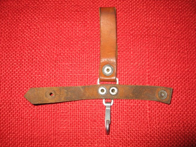 Here are pictures of the snap hook assemblies used of your ersatz Yugo hanger. These hooks were mass-produced by various US and foreign companies with minor variations. They were used on all sorts of military field gear from the 1950s -1970s. They are readily available even today in sizes from 3/4" to 2". The one pictured below is what I call a pack strap. It's a 2" wide carry strap that narrows down to a 1" snap hook. Available in bulk from many surplus stores.
