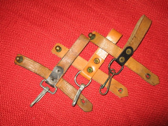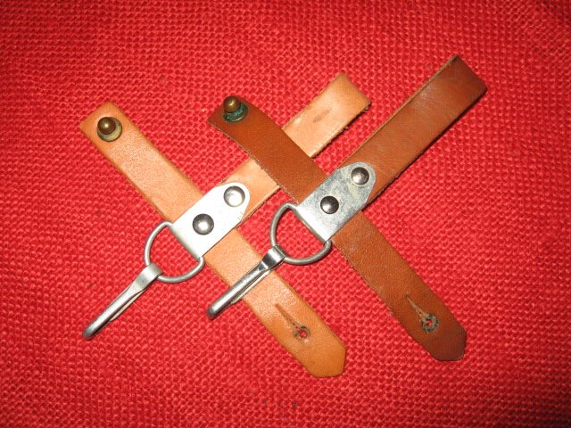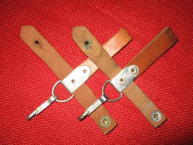 It was brought to my attention that this forum had no pictures or information regarding Yugo frog and straps so here goes. As far as I know there is only one standard original issue hanger. It is a natural tan or brown leather "T" style snap hook hanger. The ones I've seen all have had a unique brass stud on the hilt loop. They have a natural metal folded bracket secured by two open end rivets. There are two different sizes of rivets with small and larger domed heads. The "D" ring is unique also. It uses smaller diameter wire and is in more of an elliptical shape than other countries. The snap hook is unique and has fine serrations/groves on the inside.