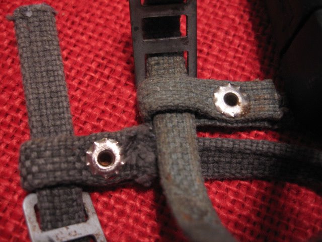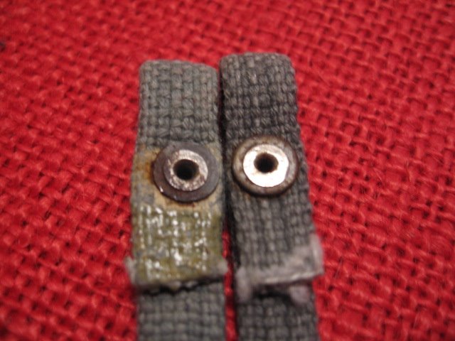 Here are a few more close ups. The 1st two show fabric color variations from light grey/green to dark green. The dark green ones seem softer than the light color fabric ones. The next two pictures are of a different unusual rivet style used without a washer. They also have a larger rivet head as compared with the more standard one shown for comparison. The last picture is of a couple with black headed rivets which to me are unusual as well. Mike