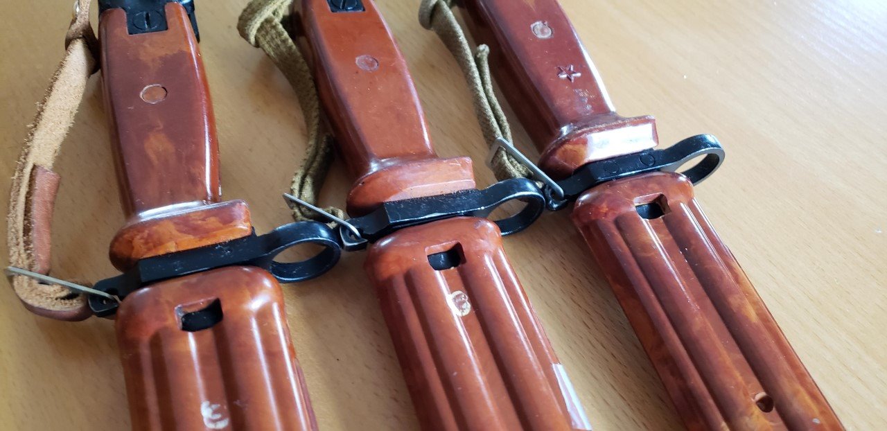 Here are pictures of Russian AKM 6X4 Type I bayonets from the Izhevsk Arsenal. These are the early and late style Type I bayonets showing the molded grips tapering to the cross guard. Compare to the squared off fronts on the Tula Type I bayonets in the lower picture below. Mike