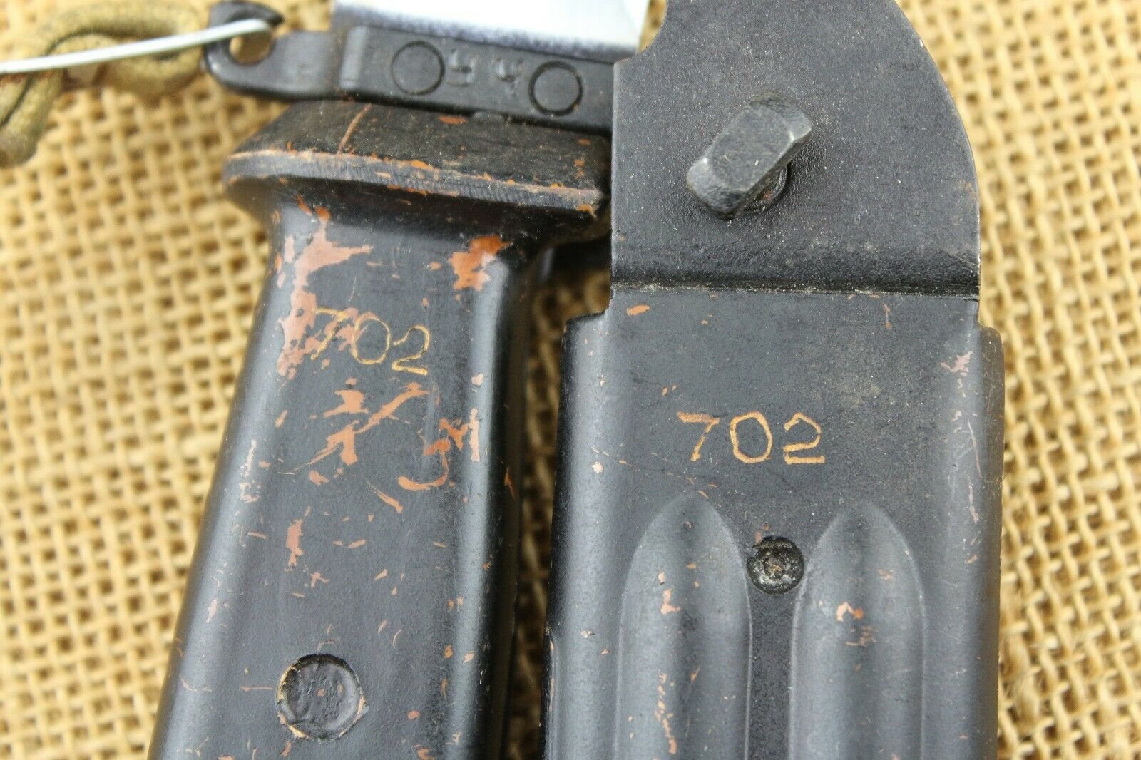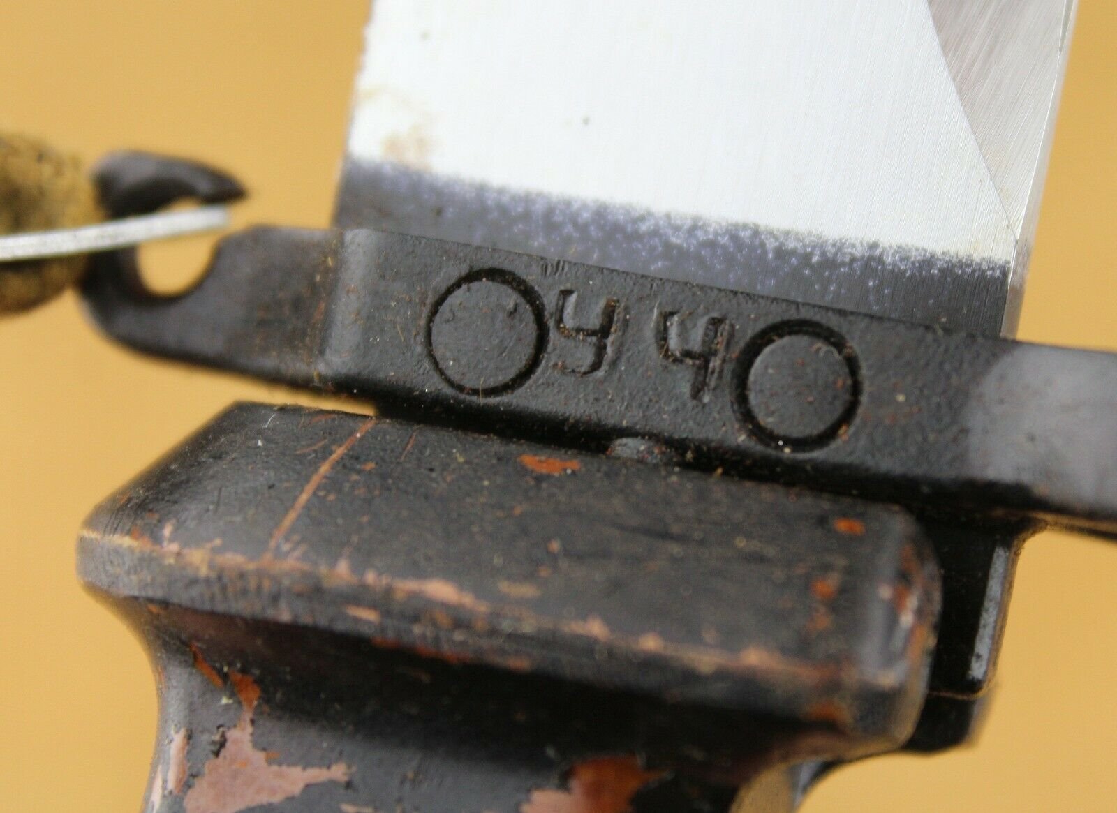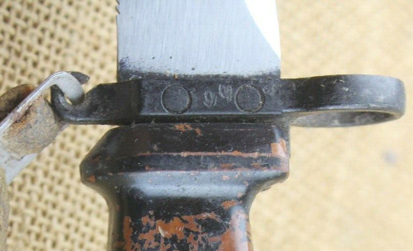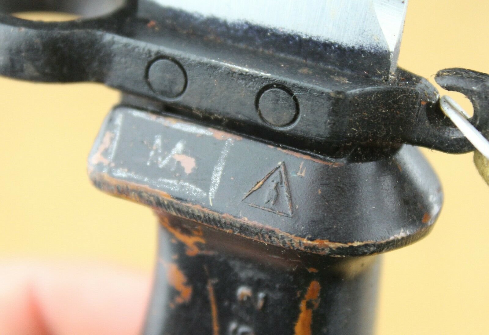 Both the bayonet and scabbard have been painted black. Two small Cyrillic letters have been stamped in the right side of bayonet cross guard and front of the scabbard cutter plate stop. These items should also have matching issue numbers as they are taken from issue inventory. Mike